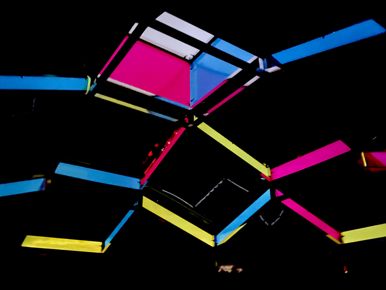 基于空间形态的几何设计,选用彩色亚克力与深色亚克力进行交错布置。从而让装置空间随着自然光线的变化和云层的移动,呈现不同的色彩组合的动态投影。使装置超越静态空间的范畴,成为具有"呼吸感"的有机体。
