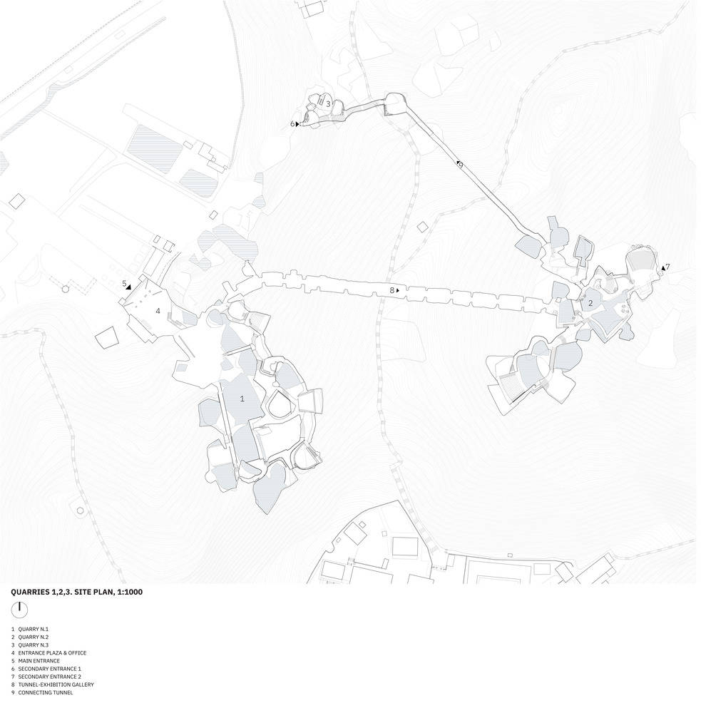 项目总占地面积约 20000 平方米,包含三个洞窟群落。设计改造的重点在于引入必要的通行路径,通过扩大平台和利用石窟现有几何形状的空间来创造停留点。这些空间主要是便于在场地内通行的走道,同时将人体尺度的活动与采石场的工业规模形成对比。在功能上,设计的重点一方面是对路径、交通的梳理,另一方面是提供停留空间,作为未来业态和活动场所,比如咖啡厅、小剧场、文创空间等等。