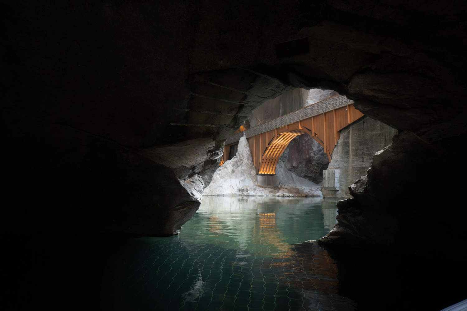 最小干预下的空间叙事与体验重塑:设计策略上,项目坚持“最小干预”原则,巧妙地保留了石窟的原始地质特征,如独特的黄色岩画和蓝绿水体。通过引入精确的交通流线梳理、设置人体尺度停留点,以及创新性地运用编木拱桥结构解决狭小施工面的挑战,实现了工业遗址向“城市客厅”的转型。特别是通过精心设计的灯光(突出黄色岩画)和水路体验(打通一号石窟水体),极大地丰富了参观者的空间感知和文化体验。