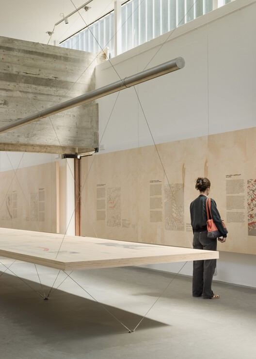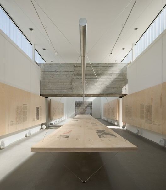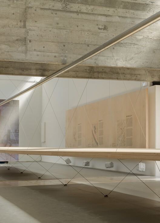 In the second hall, the exhibition system consists of horizontal panels and plywood tables made of wood from regenerative forests, interconnected by taut steel cables. The load balance within the system is achieved by marble blocks acting as counterweights, suspended from pulleys fixed to the ceiling and cables looped around rings fixed to the floor. Each set of panels is secured by two steel cables for load transfer, which interweave at a central point of the system with a circular metal tube, dispersing tension and ensuring structural stability. The tension in the lower cables originates from the vertical reaction force against the rings, causing the tables to balance the horizontal forces through compression. The tables and suspended panels together create a new structure that reconfigures the hall's space. The Carrara marble used for the counterweights was "chipped" by a local sculptor from large marble blocks into smaller pieces, with a maximum weight of 25 kg each.