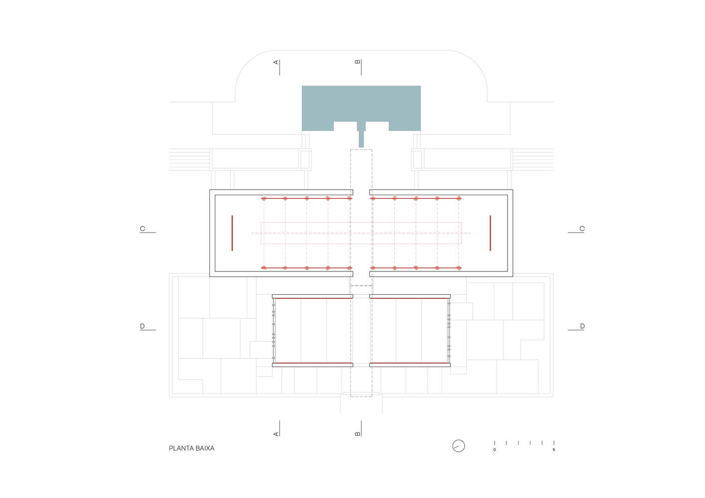 The Brazilian Pavilion in Venice was recently renovated according to the proposal by Arquitetos Associados and Henrique Penha, which was part of the curatorial team's strategy for the 17th International Architecture Exhibition. Designed by architects Henrique Mindlin, Giancarlo Palanti, and Walmir Amaral in 1960, the pavilion features two distinct exhibition halls. The smaller one has large floor-to-ceiling windows opening onto a side terrace. The second hall has no openings at "eye level," with natural light entering through large high windows (made of translucent "U-glass") surrounding the space.