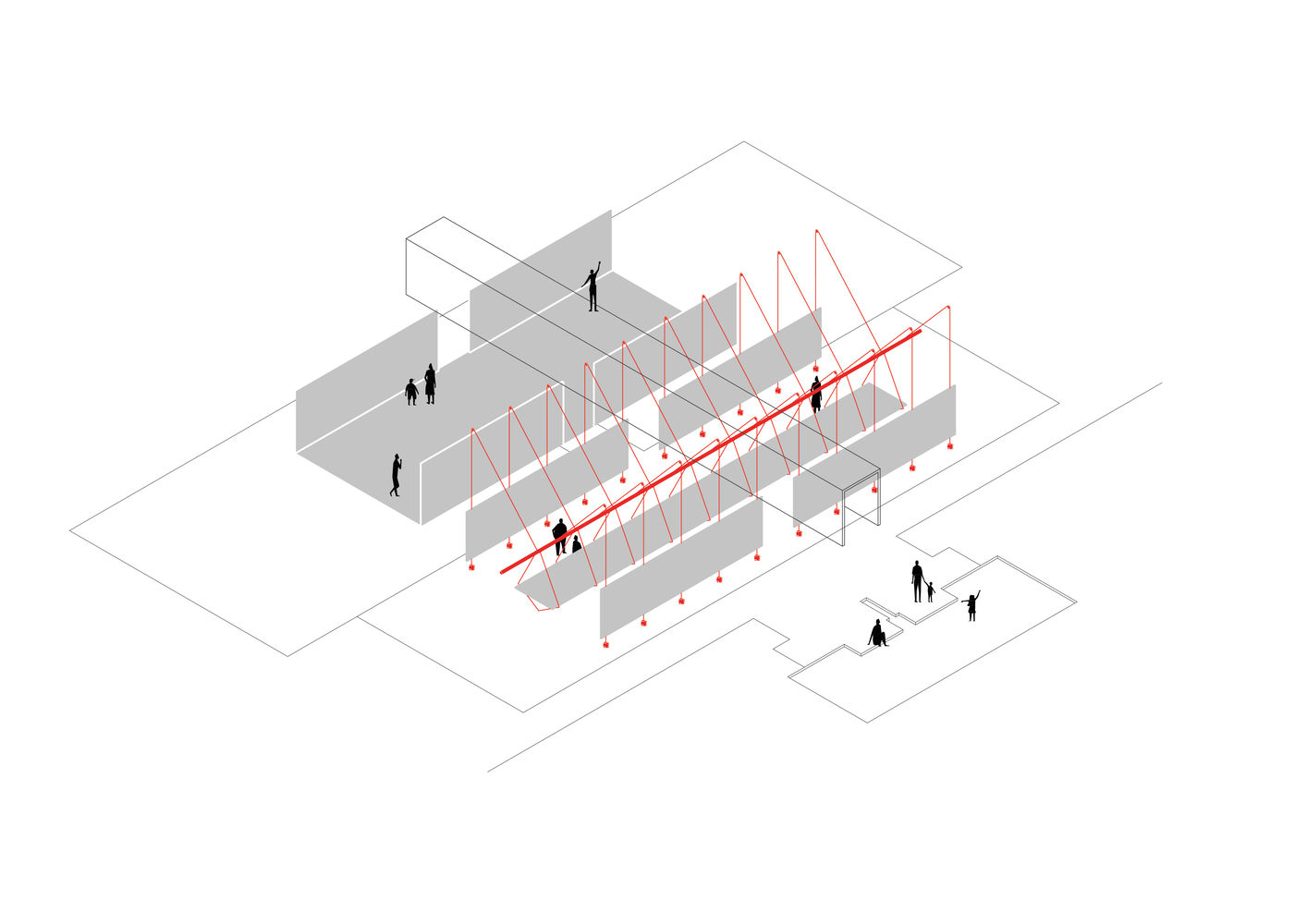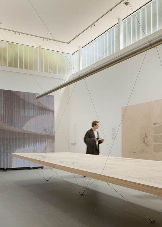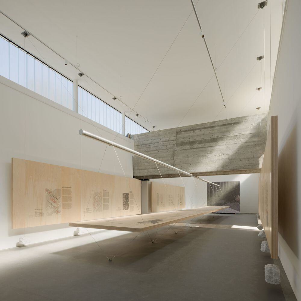 第二展厅的展览系统由水平面板和由再生林木材制成的胶合板桌组成,通过拉紧的钢索相互连接。系统内负载的平衡由悬挂在固定于天花板的滑轮和固定于地面的环上的电缆上的大理石块配重实现。每组面板均由两根钢索确保负载传递,钢索在系统中心点与圆形金属管交织,分散张力并确保结构稳定。下层钢索的张力源于对环的垂直反作用力方向,使桌子通过压缩平衡水平力。桌子与悬浮面板共同创造新结构,重新配置了展厅空间。用于配重的卡拉拉大理石由当地雕塑家将大块大理石“凿刻”成每块最大重量为25公斤的小块。