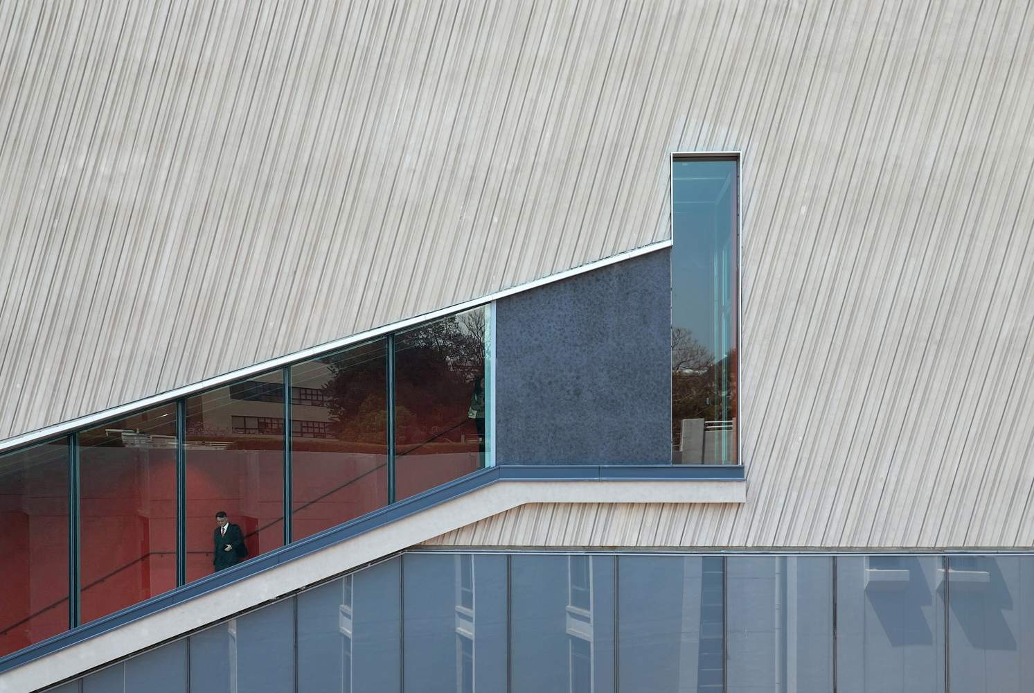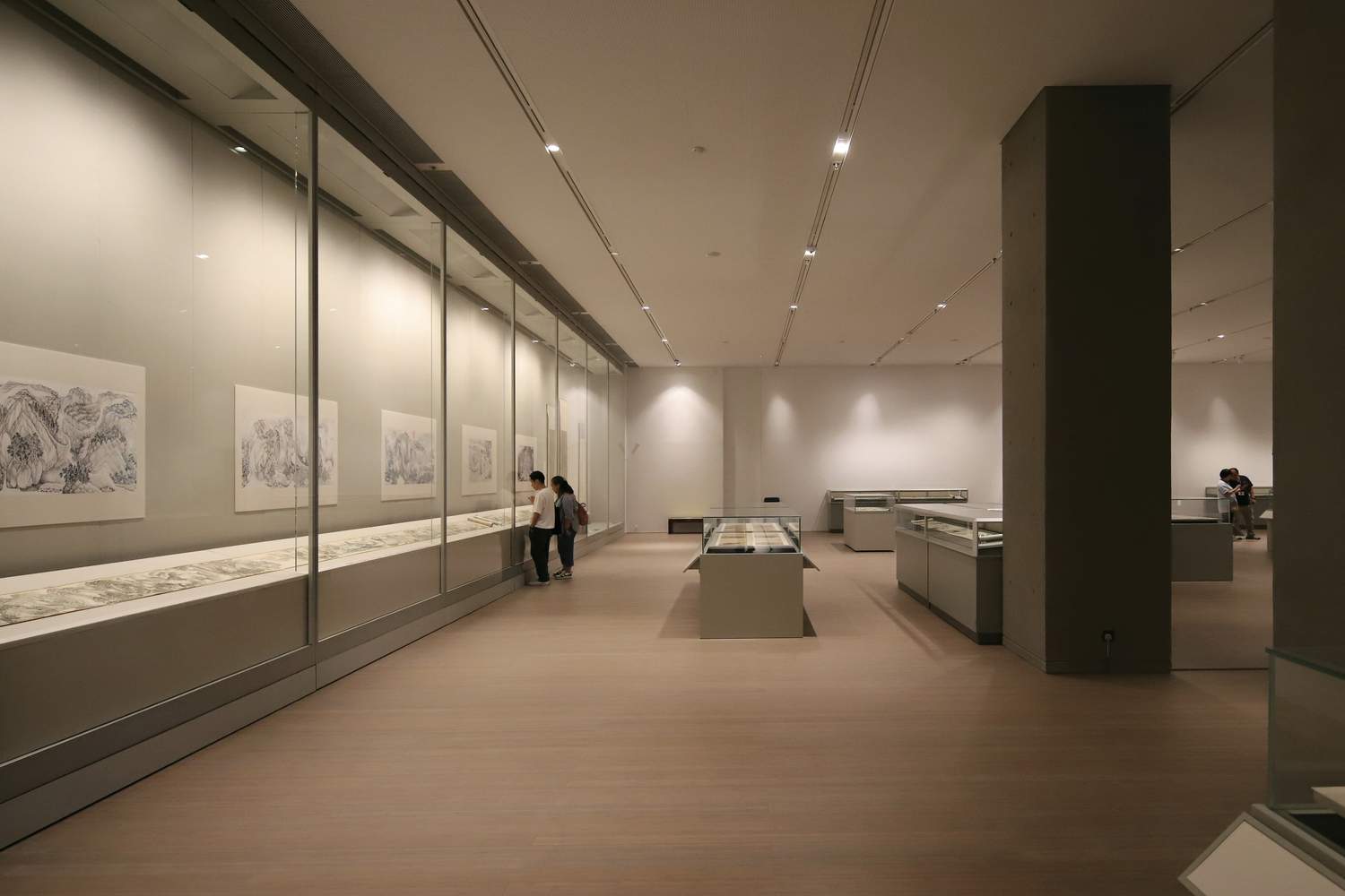 The external wall design of the new wing references the ancient technique of depicting texture using "cun" strokes (texture lines) to present the beauty of landscape painting. A unique template was designed to exhibit the subtle presence of objects, varying shades, and rhythmic density characteristic of ink wash painting on the fair-faced concrete walls.