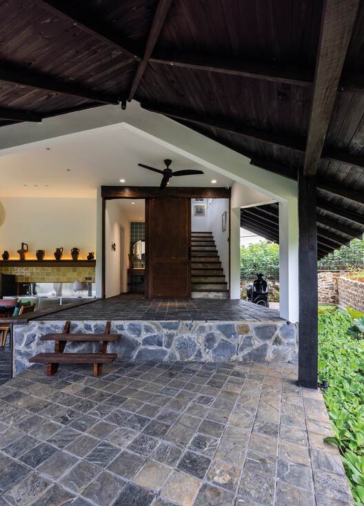 空间通过微妙的高差变化进行划分,将地形作为建筑叙事中不可或缺的组成部分加以尊重。低垂的屋檐延伸了起居空间,同时如温柔屏障般过滤着光线与雨水,黑色漆面的松木立柱与白色主体结构形成精致对比。檐下的水景装置不仅调节着局部微气候,更以自然的方式直觉化地界定了空间边界。