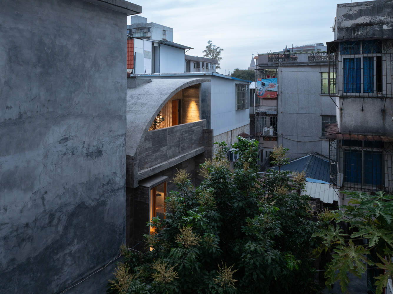 To mitigate the oppression of the high East and West walls, the roof was designed as a gentle arc. This curve not only visually dissolves the rigidity of the square box, lending a light intention to the concrete roof, but also guides vision and spatial experience. The large upward curve makes the visible sky arc outwards, dissolving the internal sense of oppression; when one is situated beneath the three-story vaulted ceiling, reclining on the specially set Luohan daybed, the sightline naturally follows the curved surface to a seemingly deeper distance, and standing on the external balcony achieves the poetic view of "watching the rain from under the eaves."