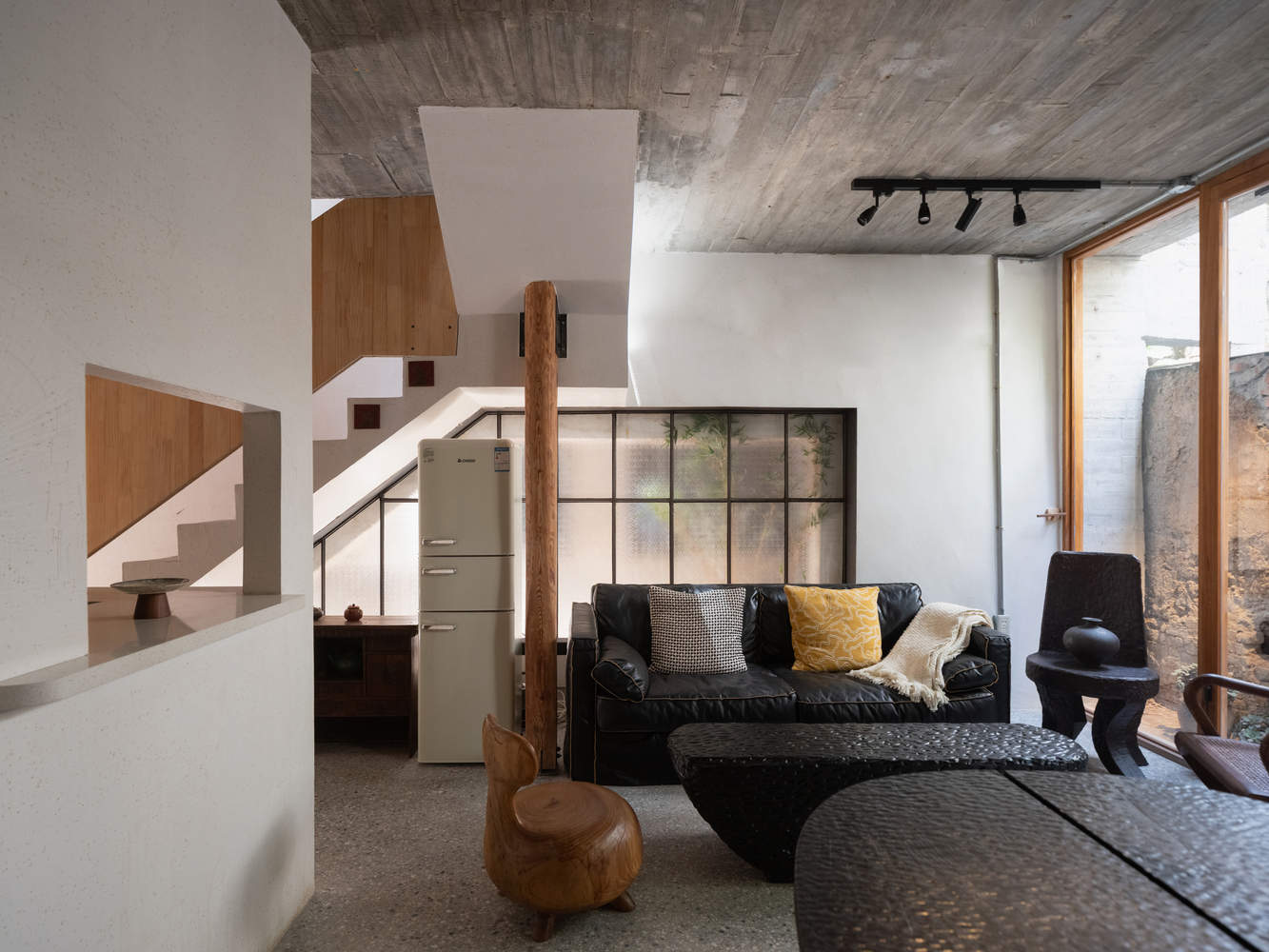 在保留的老墙垣上进行谨慎的剖断与新筑的“掏洞”操作。这些洞口大小、形状、高低各异,其功能多元:一是引入光线,使自然光成为刻画时间的画笔,在室内投下流动的光影;二是引导视线,形成一系列精心框取的景致,将外部的绿意、天空乃至墙隙造影引入室内视野;三是促进通风,与后续的通风系统结合。老墙由此从一个封闭的边界,转变为一个具有渗透性的、连接内外与古今的媒介。