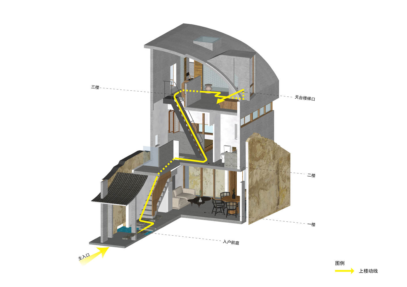 历史文脉的当代转译与精神栖居的营造:项目成功地将家族记忆与地域文化融入设计,超越了商品住宅的纯粹居住功能。通过对“爬梯”、“中心柱”、“谷仓”和“园池”等传统空间原型的当代转译,设计营造了一种具有文化厚度和精神深度的“文化原乡”。特别是弧形屋顶和仪式化的楼梯设计,不仅消解了空间的压迫感,更引导了使用者在空间序列中的身体体验和精神升华,实现了从日常栖居到精神归宿的并置,是对家族精神内核的有力锚定。