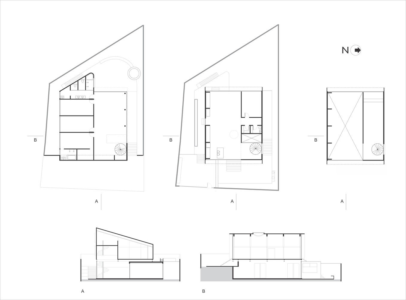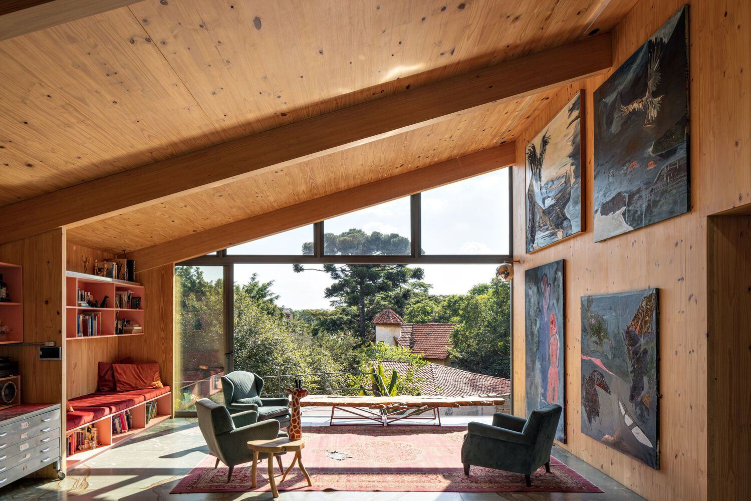 建筑的基座由混凝土构成,内设三间卧室,后花园隔绝了噪音,为卧室提供了私密空间。第二层采用钢结构,构成支撑主楼层的网格框架。第三层则包含起居室、厨房、工作室和音乐空间,采用交错层压木材(CLT)建造。所有围护结构均采用玻璃框架,而整个三角形外壳——包括屋顶和侧立面——则覆以瓦片。