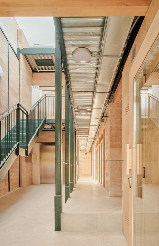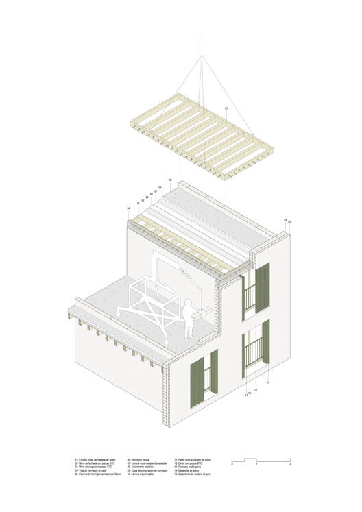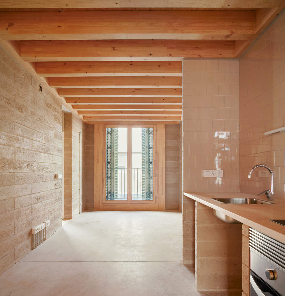 结构采用木制楼板与 BTC(压缩土块)承重墙相结合。这种材料在马略卡岛本地生产,减少了运输排放,支持了当地经济。由于无需高温烧制,它降低了能源消耗和碳足迹。其多孔性允许透气,改善了室内空气质量,并防止了冷凝。