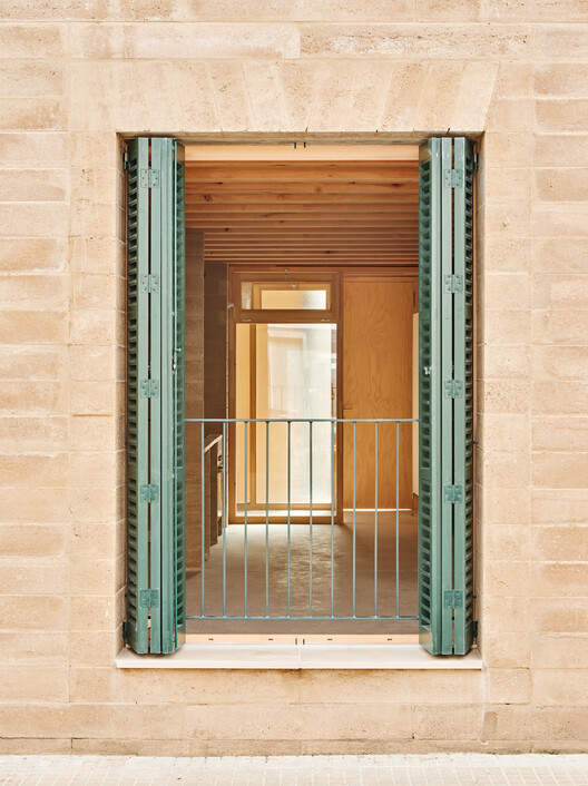The structure combines wooden floor slabs with BTC (Block of Compressed Earth) load-bearing walls. This material is produced locally on Mallorca, reducing transport emissions and supporting the local economy. Since it does not require high-temperature firing, it lowers energy consumption and the carbon footprint. Its porosity allows for breathability, improving indoor air quality and preventing condensation.