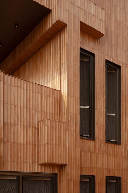 Studio UF+O 的解决方案是打造一面既非完全不透明、也非完全透明的立面,而是介于两者之间。经过严格原型测试,整个外部形态通过精确设计的开口引入自然光,并采用定制浇筑的陶瓷混凝土槽纹板进行包覆,表面为哑光陶土色。这些非正交模块以节奏性的重复排列,赋予建筑雕塑般的质感,打破了人们对珠宝店商业浮华感的预期。“打造一座彰显永恒与特色的建筑至关重要,”维尼特说道,“它不应只是一层光鲜的外壳,而应让人感觉它本就属于这座城市。”槽纹板上的光影交错为建筑表面赋予了动态质感,使其随日间时光流转而变换风貌,而开口则精心朝向北面和东面,既能引入光线,又避免室内受到眩光或高温侵扰。玻璃表面外覆有一层扩展的槽纹铝网外皮,既增添了不可穿透性,又控制了入射阳光。