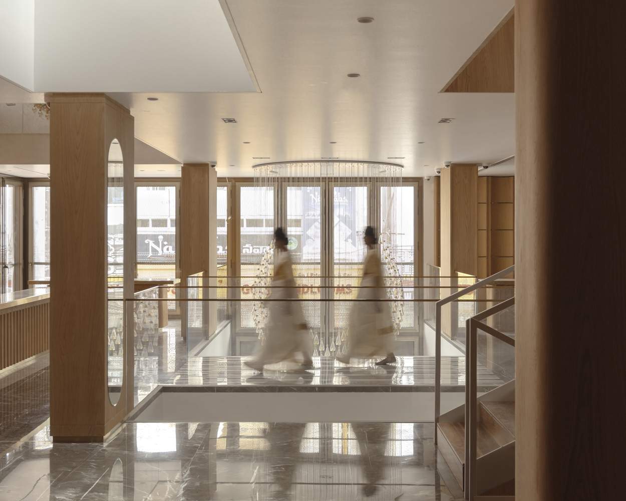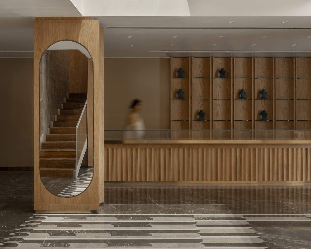 The exterior’s fluted motif also extends indoors, used in partitions, flooring, and display backdrops, creating a close connection between the brand’s architectural language and its jewelry collection. This interior-exterior continuity challenges the notion of the building as merely a container, proposing instead a cohesive spatial language where the architecture merges with the brand.