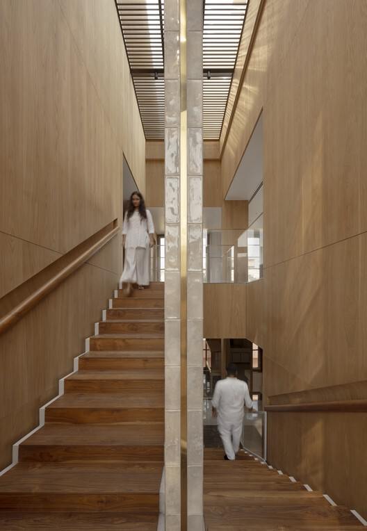 Natural light becomes the true protagonist in the interiors. A double-height volume, designed according to Feng Shui principles, draws daylight deep into the building via a skylight, visually opening up the internal space. Contrasting the monolithic exterior, the staircase on the south side is supported by ceramic glass bricks, refracting and scattering light to create a sense of lightness. “We wanted to bring in a moment of surprise,” notes Prachi, “a moment where one unexpectedly encounters the building’s refined beauty.” This radiant moment transforms what could have been a subdued interior—due to high security requirements—into a bright and uplifting environment.