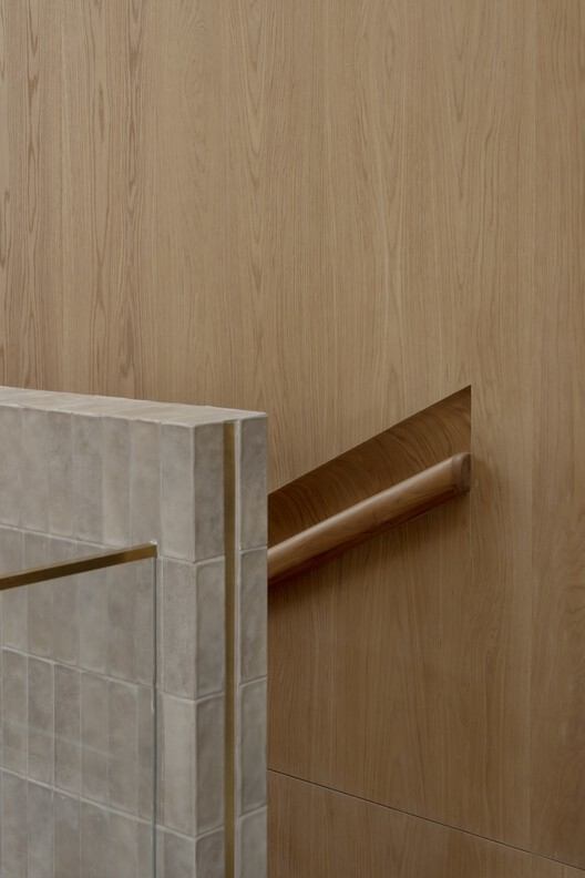 自然光成为室内空间真正的主角。一个遵循风水原则设计的双层挑高空间,通过天窗将日光引入建筑深处,从而在视觉上打开内部空间。建筑南侧的楼梯由陶瓷玻璃砖支撑,光线经过折射和散射,与厚重单调的外部形态形成对比,营造出轻盈之感。“我们希望带来一些惊喜,”普拉奇指出,“一个让人意外感受到建筑精致之美的瞬间。”这一光芒四射的时刻,将原本可能因高度安全而显得沉闷的内部空间,转变为一个明亮振奋的环境。