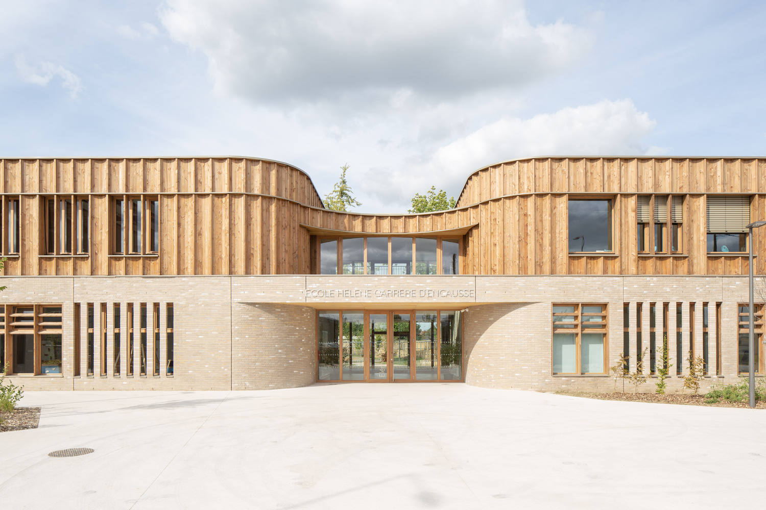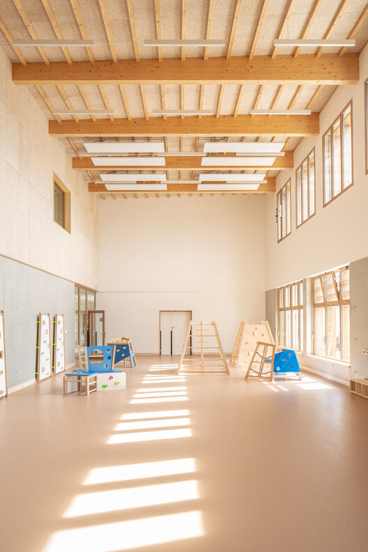 The project is built around two main materials: a concrete base clad in mineral brick, providing a solid foundation for the parts in contact with public spaces; and a wooden attic with wood fiber cladding and insulation, whose lightness reinforces the visual image of a "school in the woods."