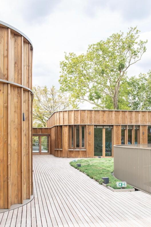 The campus complex includes 12 primary classrooms, 6 kindergarten classrooms, a kitchen capable of reheating 165 meals daily, after-school care areas, a multi-purpose hall, a skills workshop, and a library. The designers also created park landscaping, setting up tree-lined forecourts, oasis courtyards, and playgrounds with shaded areas, setting up educational vegetable gardens on the roof, and preserving the plant heritage.