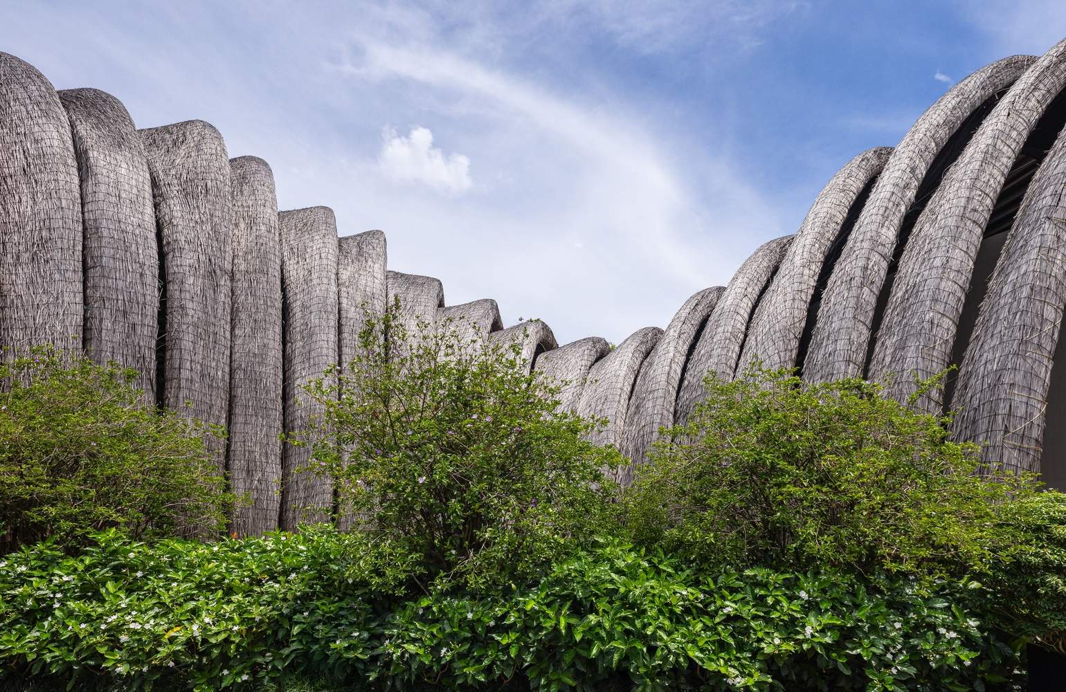 屋顶系统的创新与生态对话:标志性的白色钢桁架屋顶系统不仅是结构上的杰作,更是建筑生态策略的关键。它通过模拟山峦的褶皱,创造出动态的光影效果,并在结构上为通风和自然采光留出开口,有效地调节了室内微气候。更具前瞻性的是,屋顶采用了手工制作的当地天然材料“里白科”(guột)作为有机外皮。这种材料的使用体现了对地域性、可持续性的深刻理解,它将随时间推移而变色,深化与周边植被的融合,使建筑真正成为一个呼吸、生长的生态过滤器。