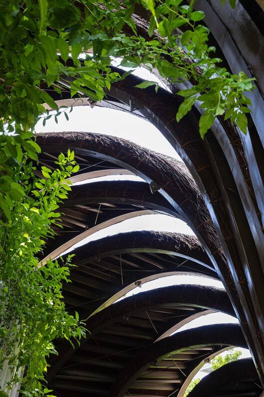 1. 果特屋顶 —— 有机外皮:屋顶摒弃工业材料,采用手工制作的天然材料 —— 里白科(Gleicheniaceae,当地称“guột”)。这种天然外皮不仅提供遮蔽,还充当微气候过滤器,使下方空间保持凉爽,并带来独特的触感。随着时间的推移,果特屋顶将改变色调,进一步融入依附其上的茂密绿色植被层。