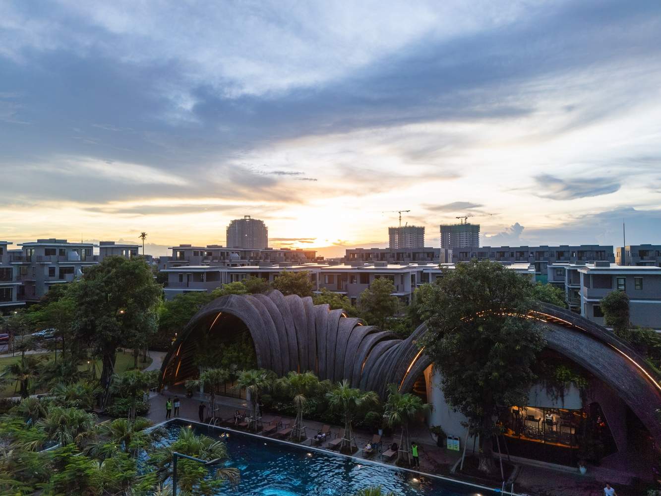 Fluid Form: From Mountains to Domes — Inspired by the majestic contours of mountains and the regional culture along the Lam River, the architects crafted a non-linear building volume that challenges the sharp angles of the urban environment. This 8-meter-high structure is not a standard clubhouse but a giant conch shell, or an architectural torrent encircling the swimming pool.