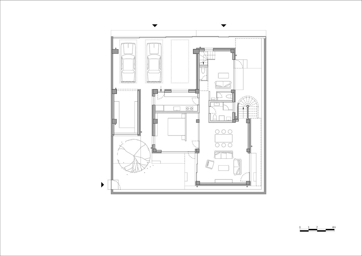 In addition to daily work, the homeowner is passionate about vehicle mechanics and requires a garage with at least three parking spaces, a requirement that almost determined that the side facing the main road must be dedicated to the garage function. Thus, the three-car garage opens to the northern village road via a sliding door, which can open entirely, serving both for external access for spaces like offices and breaking the enclosed convention of the rural streetscape with an open posture.