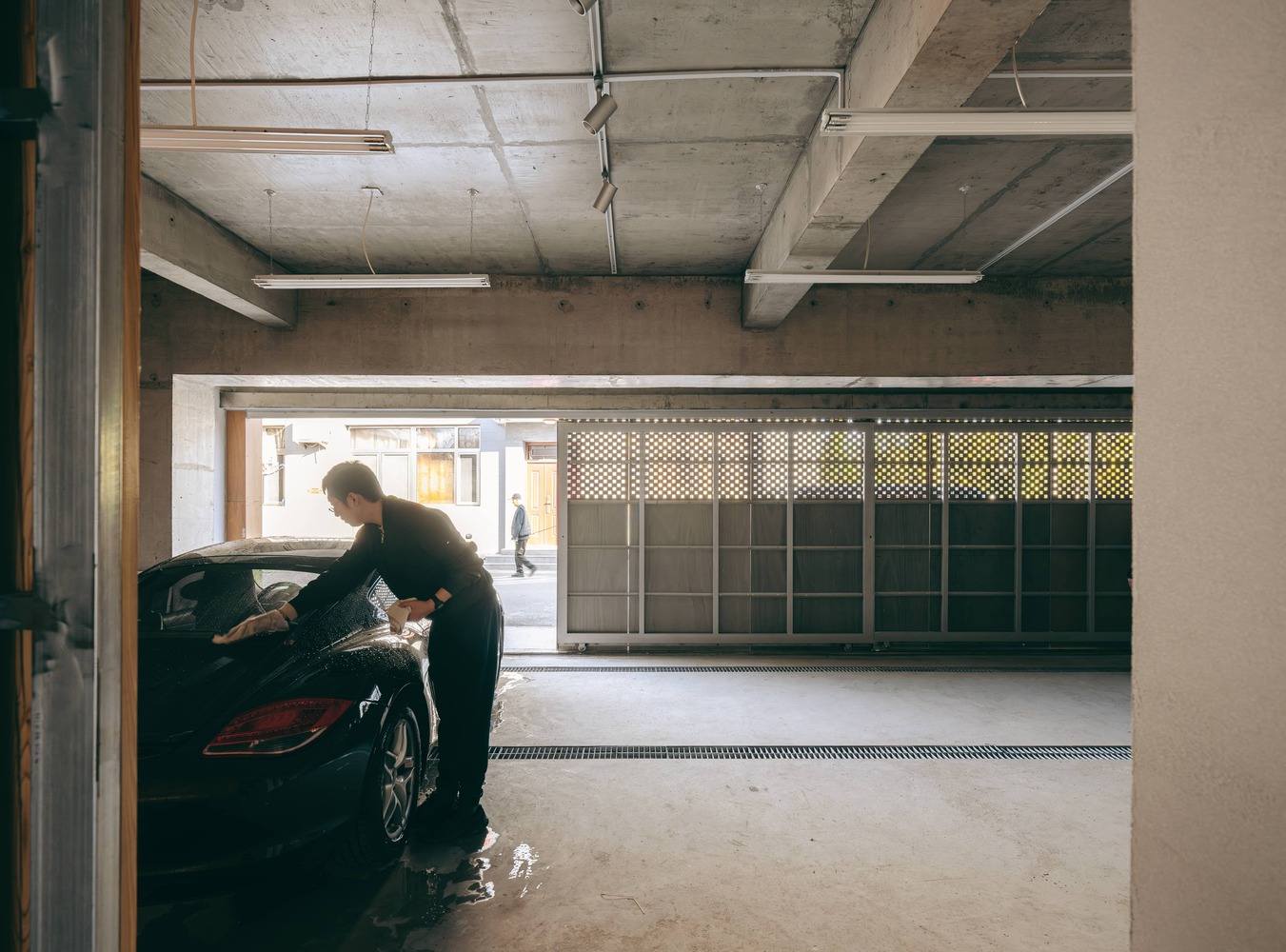 在日常工作之外,房主热衷于车辆机械,需要至少三个车位的车库,这一需求也几乎确定了临主路的一侧必须留给车库功能。于是,三车位车库以平移门的形式面向北侧村路展开,大门可整面打开,既可满足办公等对外空间的出入功能,又以开放的姿态打破乡村街面的封闭惯常。