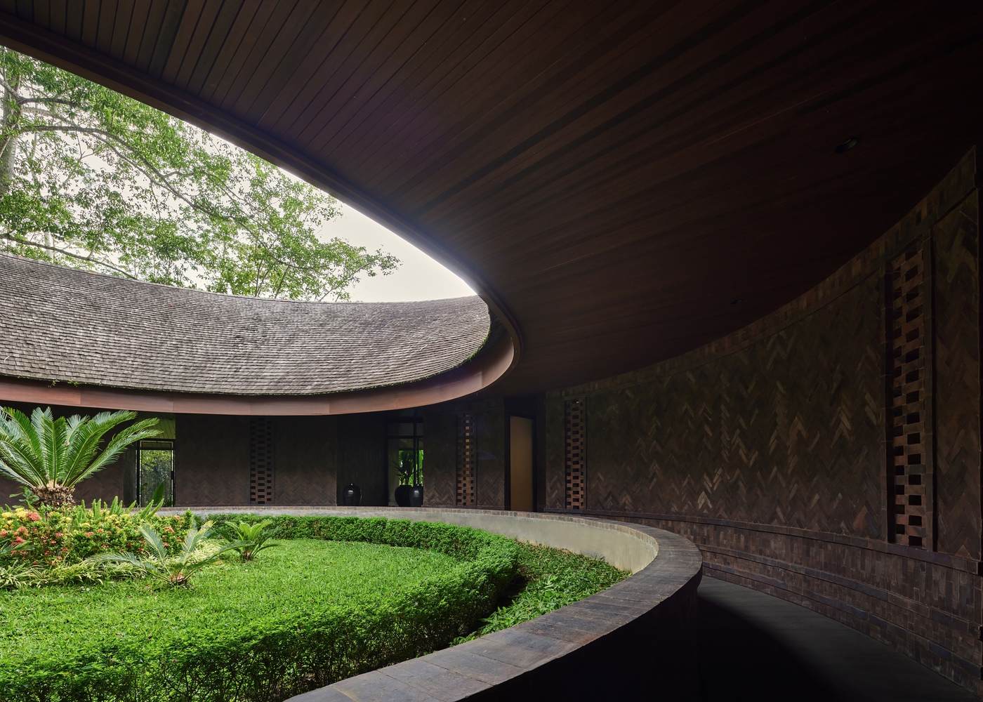 材质运用与表面处理汲取了巴厘岛编织工艺的传统精髓。人字形图案铺就的砖砌工艺、交织的墙面纹理以及微妙的几何图案,以现代手法重新诠释了当地工艺。这些细节增添了建筑的触感与层次感,却并未喧宾夺主。这所房子引人细细观赏;它细节丰富,却依旧保持宁静与沉稳。