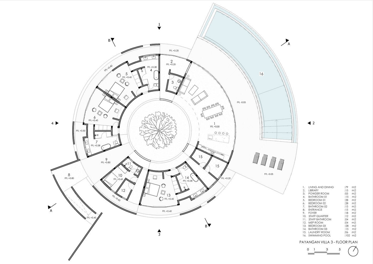 同心圆的秩序美学与叙事性:建筑的布局深度呼应了中心辐射式的同心圆几何逻辑,从平面划分、泳池尺度到步道系统,均围绕一个共同的几何中心组织。这种统一的母题不仅为建筑带来了强烈的秩序感和静谧的氛围,更赋予了建筑一种动态的叙事性——如同涟漪扩散的形态,简洁、易读且具有高度的连贯性。这是一种高级的几何抽象表达,将复杂的居住需求内化于纯粹的形态之中。
