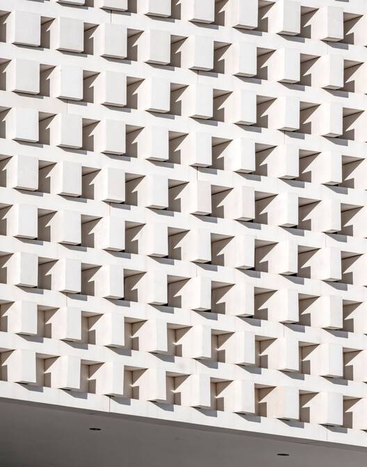 与许多新兴城区一样,周边的建筑风格杂乱无章,充斥着不协调的建筑元素。与所有夸张张扬的建筑姿态形成鲜明对比,这座塔楼呈现出一种静默无声、近乎沉默的建筑风格。这座巨型建筑由大小各异的巨大白色原始混凝土块堆叠而成。
