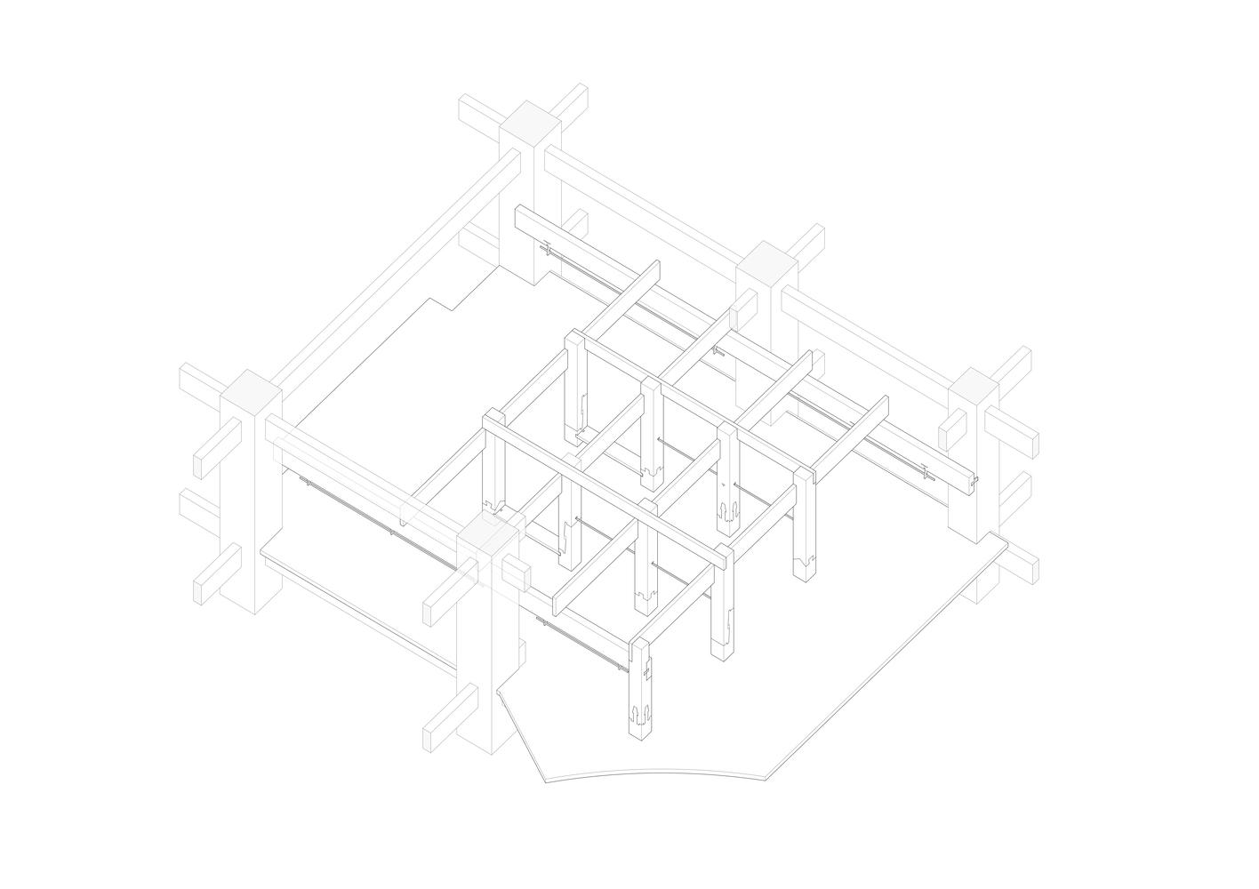 Although traditional stacked-beam wooden frames rarely use mortise and tenon joints between columns and beams, in order to maintain the overall construction logic, this project employs half-lap joints. Due to transportation and on-site installation constraints, the full-length wooden beams must be segmented, with these segment joints also treated with half-lap joints, ensuring that the details are clearly presented while retaining the structural mortise and tenon nature.