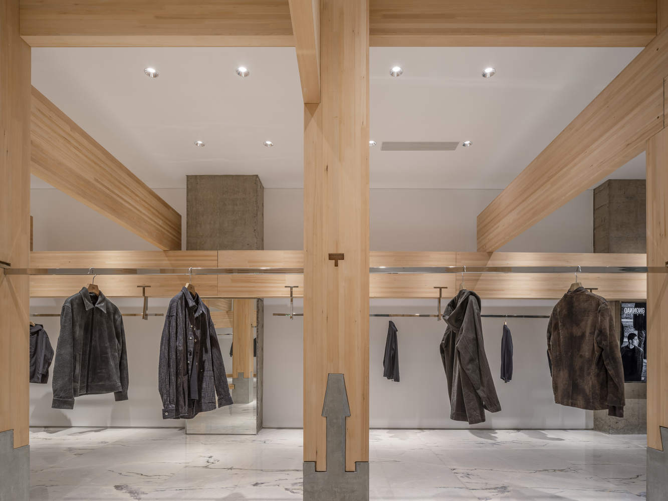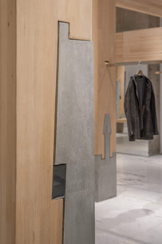 东方传统木构讲究家具与建筑构件的统一逻辑。店中的坐具通过榫卯方式卡入混凝土柱绌,使家具成为结构系统一部分;挂衣杆则预先在柱上开卯口,再将金属杆以卡榫方式嵌入,形成尺度由大至小而语言统一的建造体系。