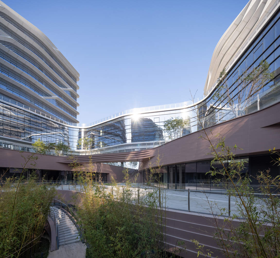 “云环”裙房的底层大面积架空,使一个周长达 400 米的超大型围合式裙房轻盈灵动的悬浮于地面之上,萦绕在三座塔楼之间。这种塔楼与裙房连接的渗透式空间体系更具弹性,并带来灵动的共享与社交功能。“云环”顶部是有机串联起三座塔楼的屋顶花园,也是向市民开放的空中绿地公园。屋顶花园红色步道与下沉庭院 GRC 三维曲面立面的棕红色语言统一,并与绿植景观互衬,这都是对“三山五园”红墙绿树的遥相呼应,描绘出东方历史人文色彩。