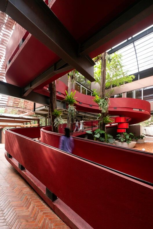 通过分离立面以形成通风走廊和热压通风通道,并用蜿蜒的花园坡道取代机械升降设备,该设计挑战了垂直交通的标准模式。其结果是大幅减少了对空调和电梯的依赖。它宛如一座希望的灯塔,表明在发展中经济体中,无需以牺牲环境适应性为代价来换取经济收益。