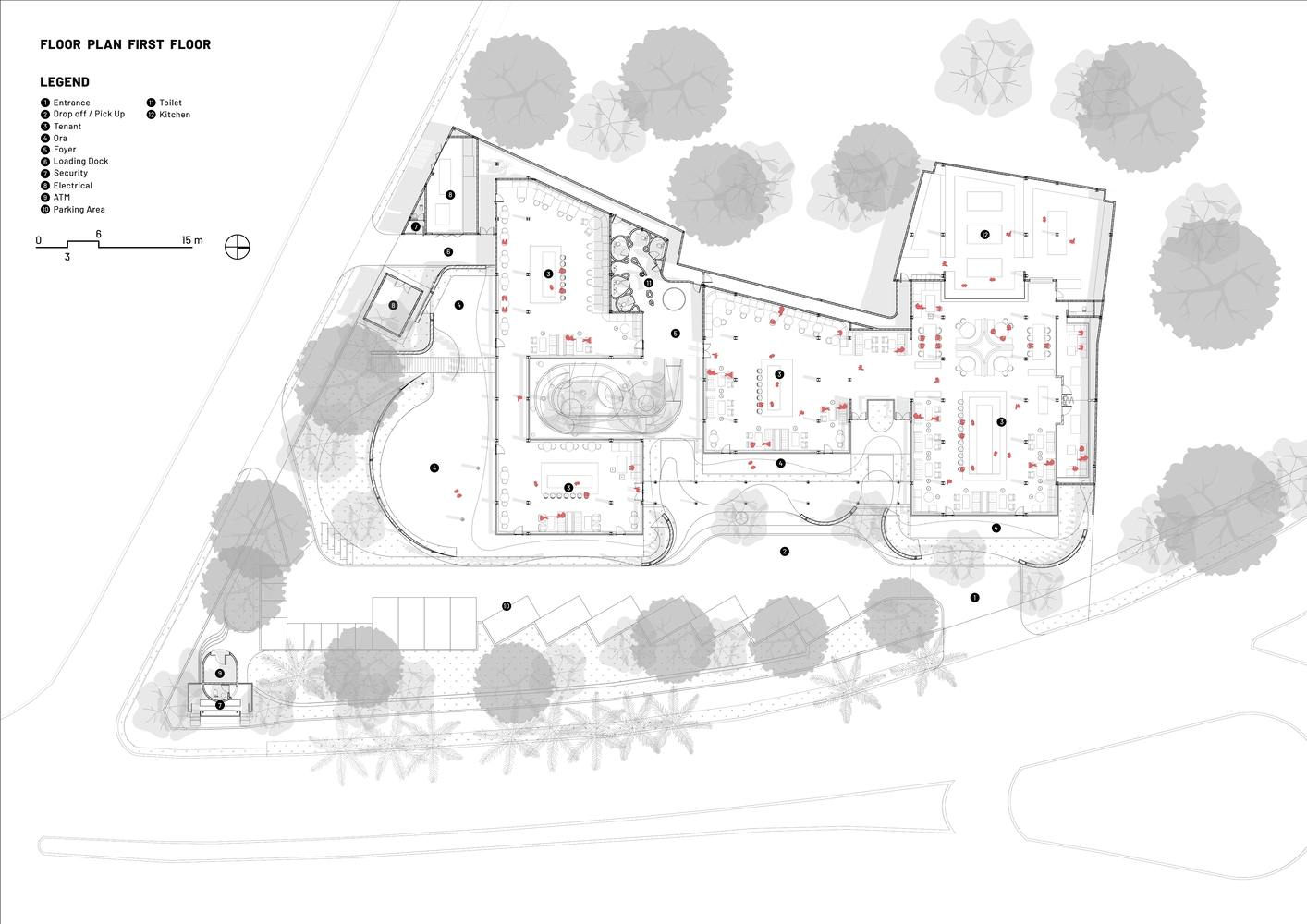 To coexist with the site's ecology, the design maintains a minimum of 40% ground coverage, cleverly planning leasable areas and activity spaces to interweave with the existing 20-meter-tall trees. The design derives the building volume by first defining the retained tree areas, rather than treating the landscape as an addition to the architecture.