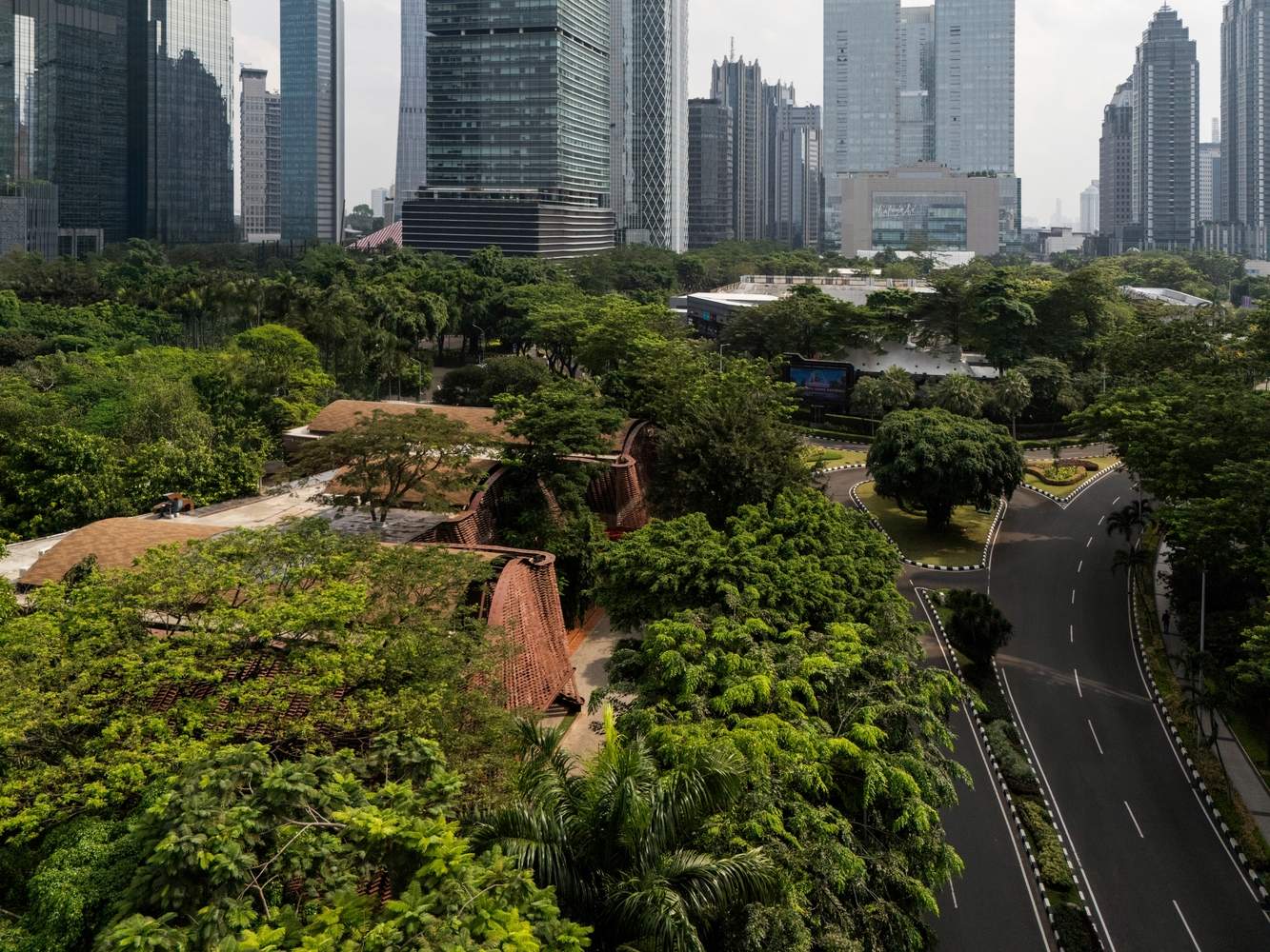 Hundreds of years ago, the principle of the gable structure was crucial in Indonesia's hot and humid tropical climate, serving as a key element for achieving basic climate regulation and an excellent example of bioclimatic design. Re-adapted with greater design freedom and flexibility through double coding (functional and symbolic), the gable structure becomes a modern, high-performance shading device, while also serving as a visually rich curtain tightly connected to the local context, recalling the region's architectural explorations in sustainability.