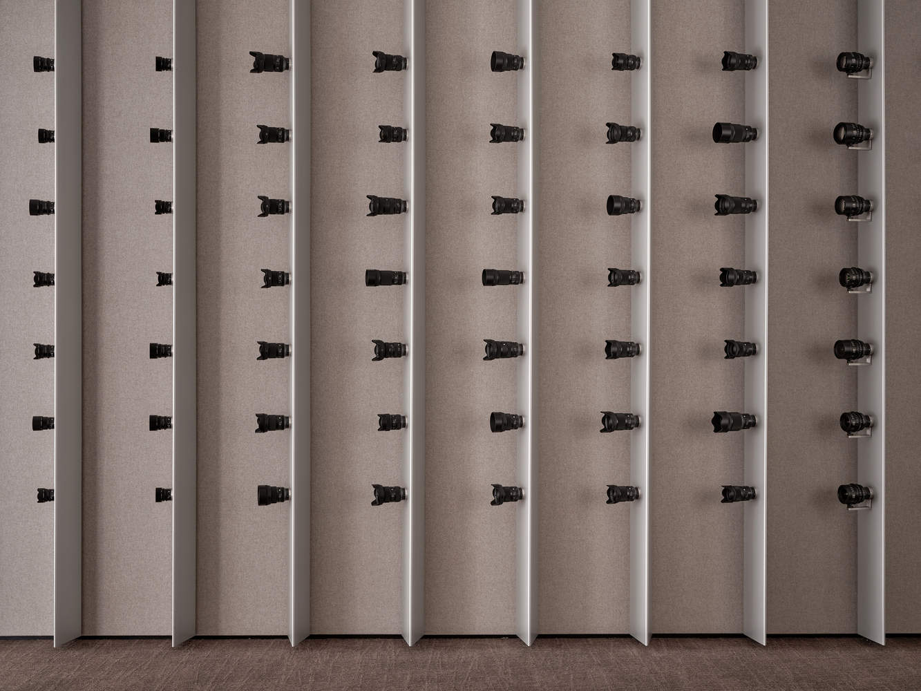 进入产品体验区,映入眼帘的是一大面镜头墙,从地板直指天花,数代产品整整齐齐陈列其上。设计师采用三角立柱系统,研究所有镜头系列的卡扣系统和产品规格,将部分卡件开模,完成一面 3 米高镜头墙的视觉呈现。