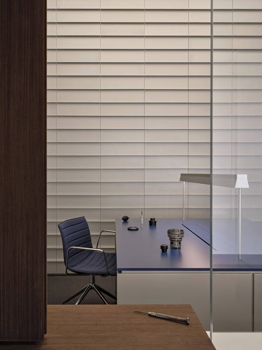 展厅的室内墙面采用了 Kvadrat Acoustics 系统,将应用、形状和声学功能相结合,做到最大宽幅的无缝隙处理,并提供极安静的空间状态,回应品牌“精密”产品的属性,也达到空间概念中“造”(The Ways of Crafting)所表达的严苛与匠心。
