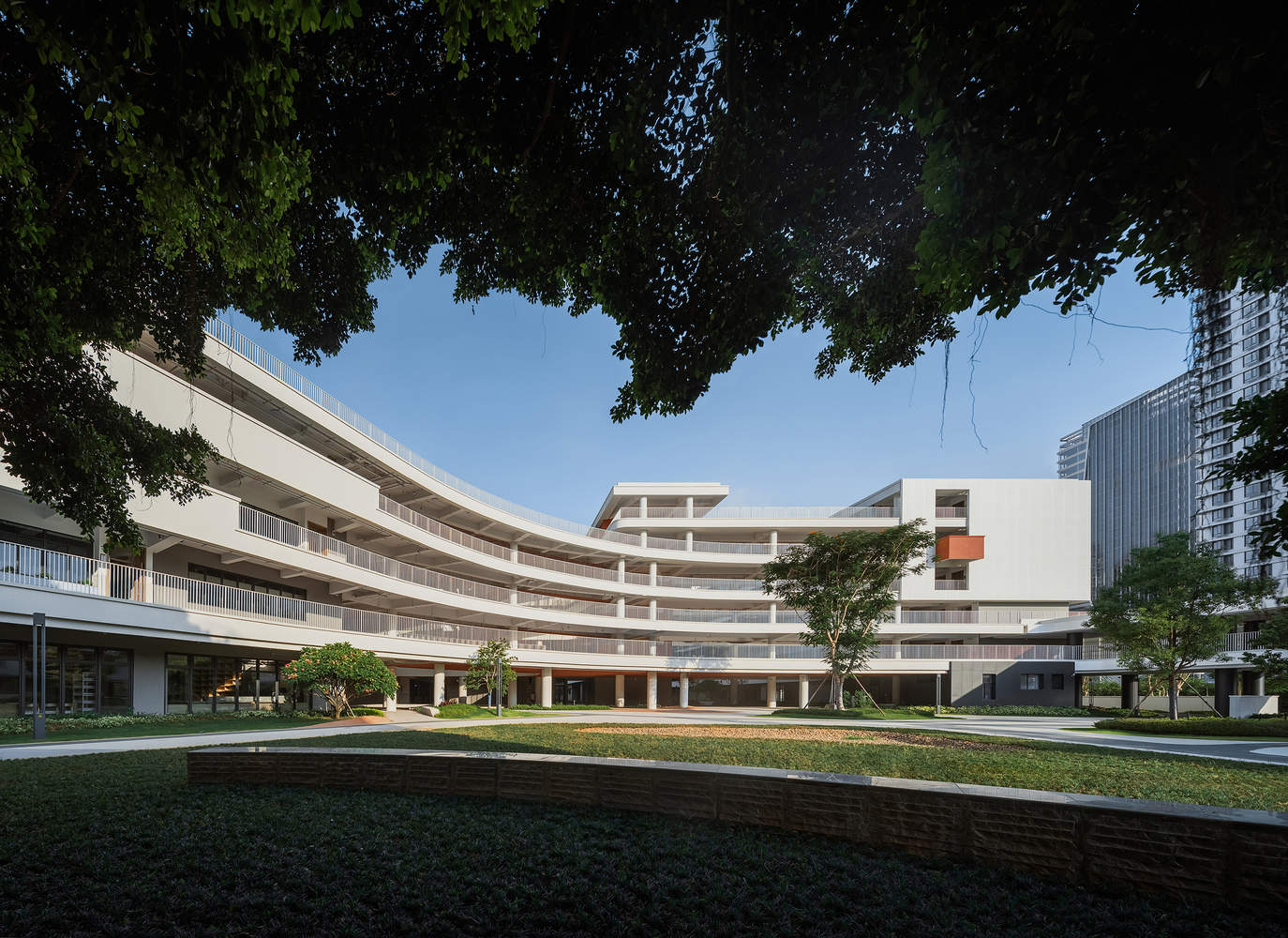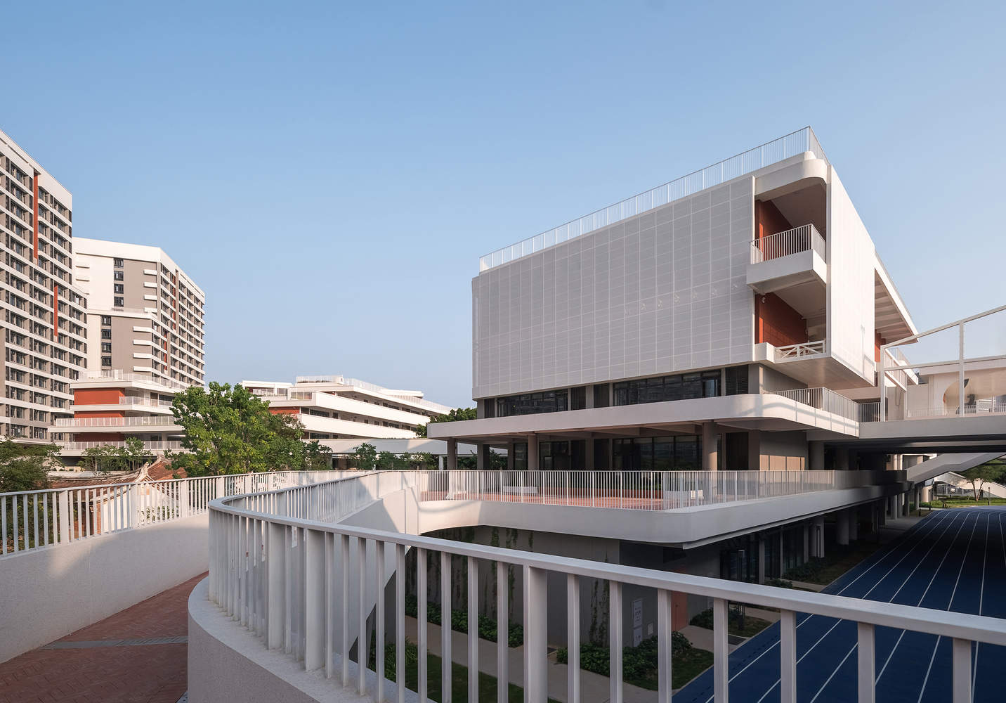 The elevated sports field resembles a giant floating terrace, leaping above the campus—outwardly, it receives the continuous greenery of the wetland park and offers views of the Ring Island Expressway; inwardly, it overlooks the figures of students running on the track. The distance between the natural elements—nature on one side, the city on the other, and the campus in between—is brought closer.The large curve of the teaching building stems from the overall concept of guiding the building mass towards the Folk Culture Park after entering the school gate. The large terraces, receding layer by layer, open towards the west, fully capturing the sunset scenery in every moment of the four seasons. These terrace spaces ultimately create a high-quality free activity area for teachers and students.
