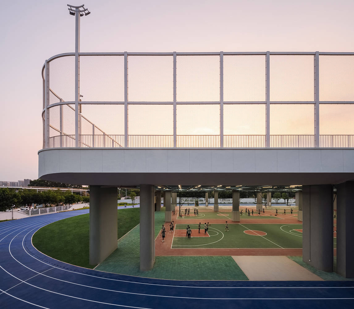 架空的运动场如同一块悬浮的巨型露台,腾跃于校园之上——向外,它承接湿地公园的一线绿意,可远眺环岛干道的街景;向内,能俯瞰跑道上奔跑的同学身影。自然、城市与校园,一边是自然,一边是城市,一边是校园,几个不同要素之间的距离被拉进。