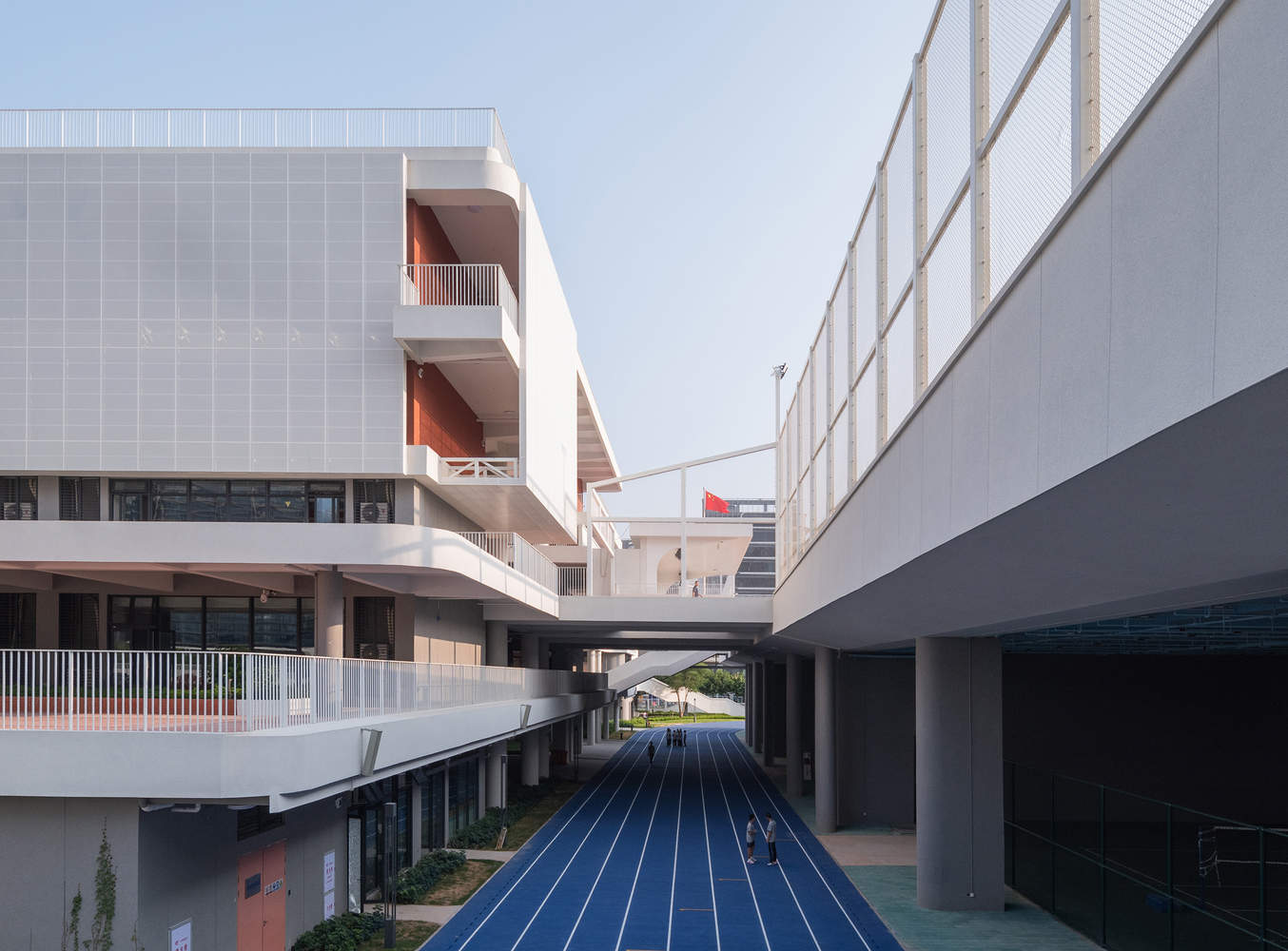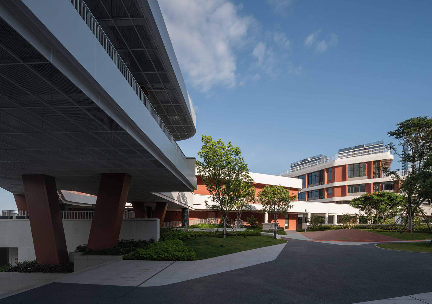 The double-sided setbacks of the Science and Technology Innovation Building echo the views of the Folk Culture Park and the Wetland Park—this not only connects the Folk Culture Park on the east side with the Wetland Park on the west side in terms of urban spatial morphology but also becomes a quiet corner for teachers and students to contemplate and meditate during breaks. Both banyan trees on the site were completely preserved: the one in front of the teaching building is an important focal point for the main campus entrance, where the large curve of the teaching building also converges; the other stands between the Science and Technology Innovation Building and the track, its branches drooping like an umbrella over the track, becoming a key spatial node in the northwest corner of the campus.The red brick gene of the Folk Culture Park is also incorporated into material selection: red bricks are widely used for outdoor paving, rough yet warm to the touch, and conveying the rich texture of old Minnan houses underfoot. Walking among them, the modern campus quietly establishes an emotional connection with the remembered Minnan streets and alleys, and the sense of regional belonging is subtly laid at one's feet.