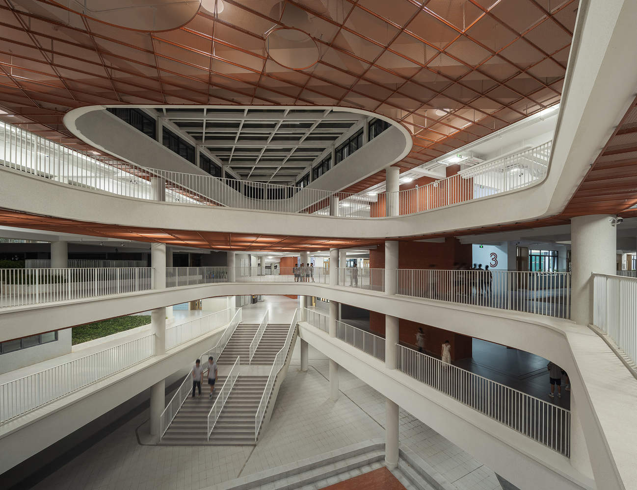 教学综合楼的中庭空间,为营造良好的空间氛围与层次,设计团队在结构设计上付出了诸多努力与尝试。结构刚拆除脚手架时,也确实呈现出了较好的空间效果;可惜在后续建造过程中,这一空间效果未能得到妥善延续,成为本项目最大的遗憾。