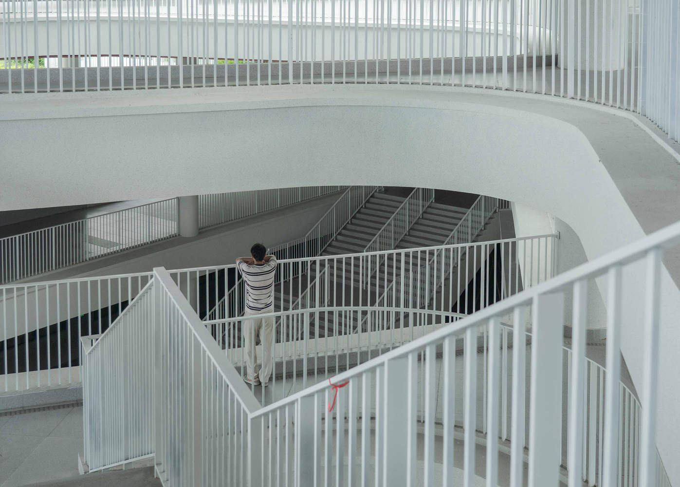 教学楼的大弧线,来源于进入校门之后并把建筑的形体往民俗文化园方向衔接引导的大思路,逐级内推的大露台朝西敞开,四季流转间,每一时刻的落日风光都能被完整收纳。这些露台空间,终为在校师生筑起了高品质的自由活动场域。