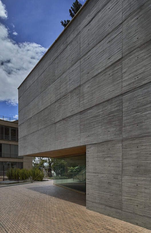 Outdoors, the concrete plays a role in the landscape. The material's gray tone blends with the Bogotá sky, while the green roof and rainwater gardens planted with native species extend the campus topography. Footpaths follow the terrain, connecting the School of Architecture with the old center and addressing accessibility issues without altering the site's character. "The building plays a silent role between the heritage brick red and the orange of the neighboring buildings," López describes.
