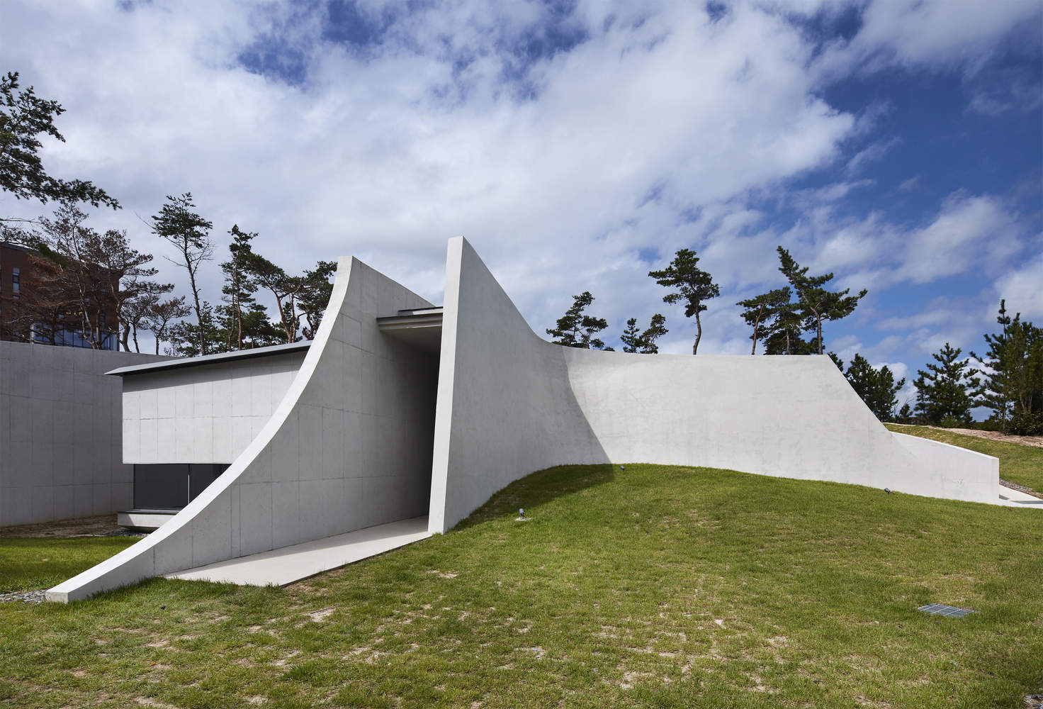 For the architect, a Christian, the overall outline of Handong University resembles a sheep, with a small hill at the center of the campus being particularly prominent. This location offers an excellent vantage point, visible from surrounding campus buildings, and the design intended to outline the shape of a cross from an overhead perspective, rather than from the eye-level view.