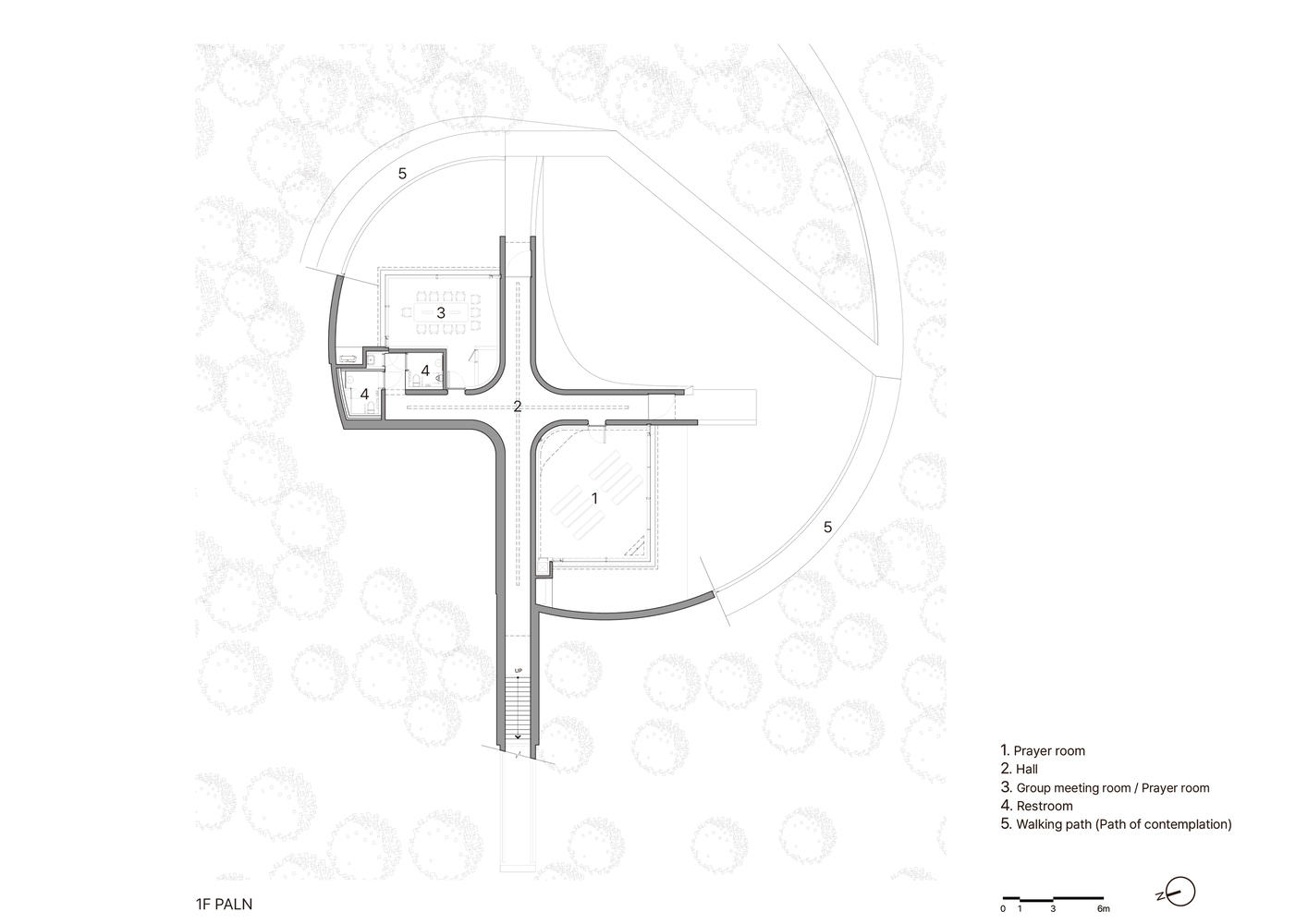 选址的象征意义与俯瞰的叙事性:项目选址于韩东大学内一处高耸的中心山丘之上,这一决策不仅是地理上的选择,更是深思熟虑的象征性布局。建筑师以“绵羊”喻指大学整体轮廓,将祷告室置于焦点,使其在校园中具有极高的可见性。更精妙的是,设计意图并非侧重于人眼平视的体验,而是从高处俯瞰时能清晰勾勒出十字架的轮廓,这种由上而下的叙事方式,赋予了建筑超越个体体验的宏大精神指向,体现了设计对场地精神和神学主题的深刻理解。