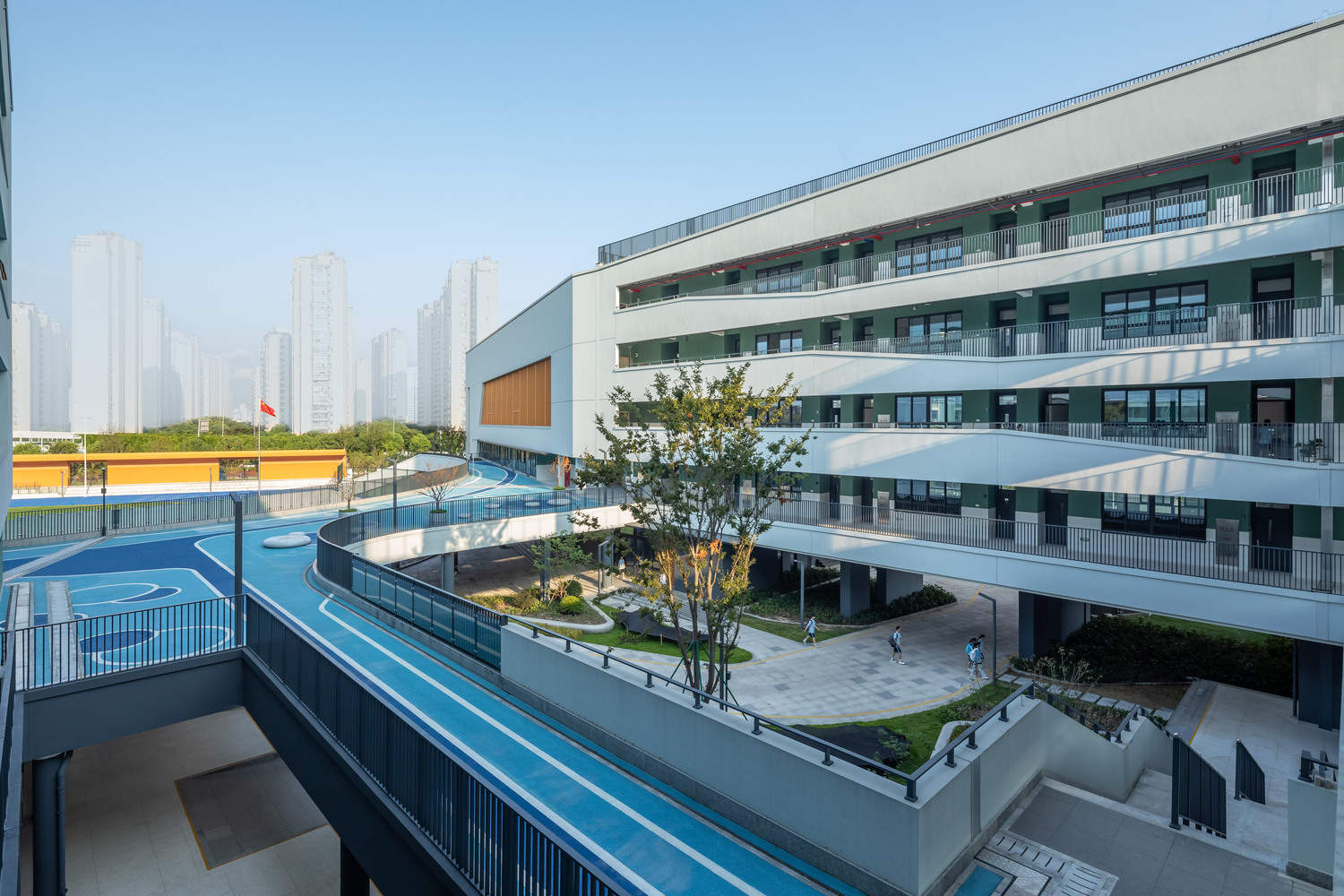 跨越物理隔阂的教学一体化:为解决城市道路对校园功能分割的问题,设计采用了极具前瞻性的“空中连廊+核心庭院”策略。封闭式空中连廊确保了中小学间安全便捷的交通流线,而下方的入口庭院则与连廊共同围合成一个内向、共享的“智慧谷”。这种动静结合(“运动谷”与“智慧谷”)的空间格局,不仅实现了公共教学资源的优化配置和高效共享,更在物理上连接了功能上分离的两个地块,最终塑造了一个在安全、活力与共享性上达到高度平衡的现代化教育复合体。