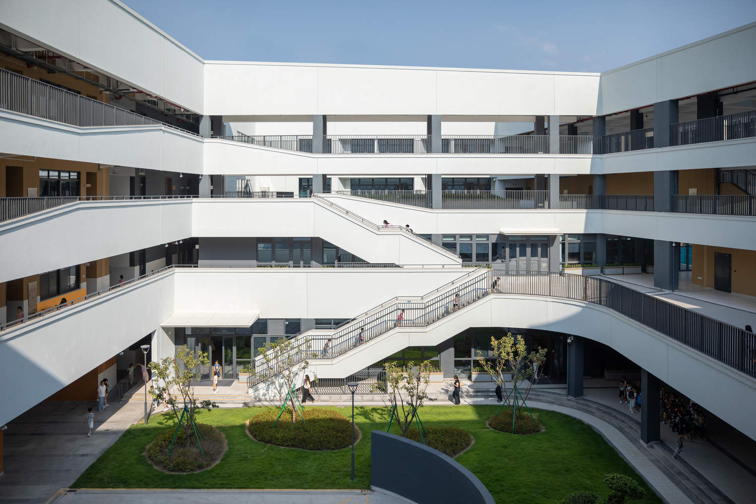 为化解因避让地铁盾构线导致的用地局限与高容积率挑战,本案采用了双管齐下的设计策略:首先,通过院落组合模式打破空间局限。设计植入多组功能有别的主题院落(如学习庭院、生态花园、文化中庭),并利用架空层将其巧妙连接,形成一个有机整体。这些庭院虽在形态、尺度、风格和标高上各有特色,但均来自于咽喉区形态的拓扑变形,在有效改善采光通风的同时,更构成了一个极具趣味性的非正式学习与交流空间体系。其次,积极进行垂直开发与平台联动。由于地面场地有限,设计转而向立体空间寻求解决方案,充分利用了咽喉区上方、架空层以及各层屋顶等空间。通过大台阶、坡道等积极的竖向交通设计,将这些不同标高的平台串联起来,最终构建出一个完整统一、流动而富有活力的立体公共空间网络。
