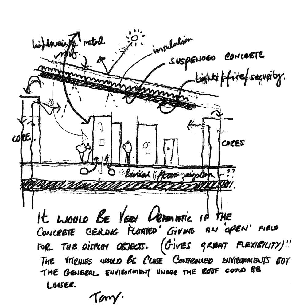 The museum is situated on a desert plateau formed by the Nile thousands of years ago, and its geological context is an integral part of the design. The museum building begins as a focal point outside the entrance, radiating outwards along a visual axis directly aligned with the position of the three pyramids. The interior walls extend along these radial lines, forming a fan shape, and the roof slopes upwards along similar visual lines, meeting the highest points of the pyramids but never exceeding them. This direct dialogue between the museum and the pyramids reinforces the connection to the locality and creates unparalleled views, making the pyramids seem like part of the museum.