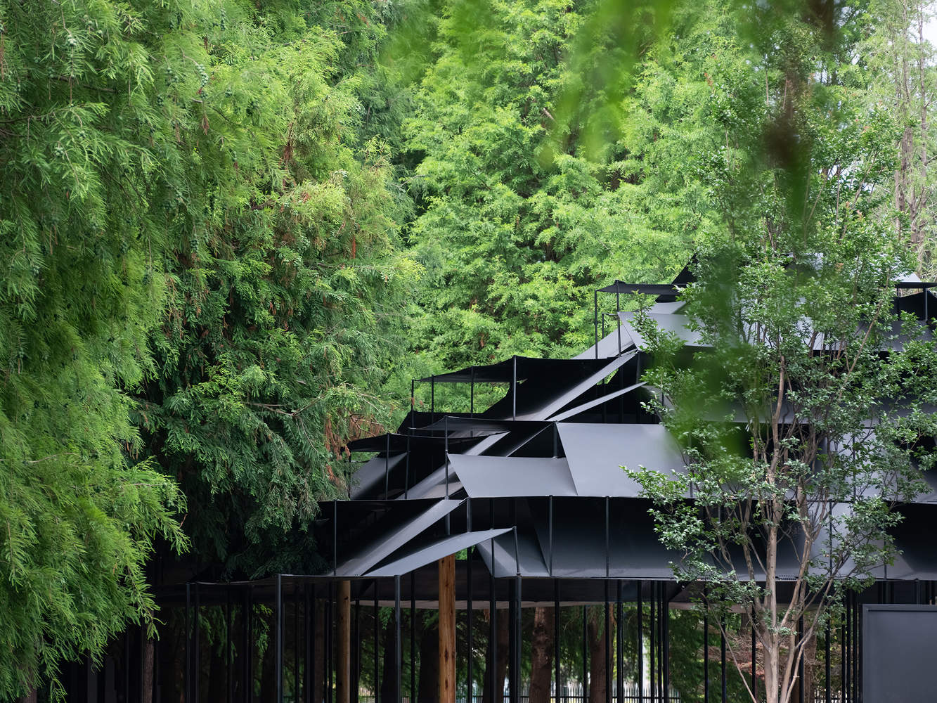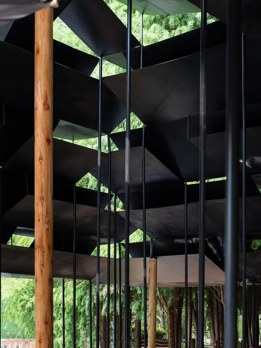 When viewed from a distance, the pavilion presents an image resembling the hipped and gabled roof (sipo wudian) in traditional Chinese architecture. However, due to the fragmentation of the roof, it also appears to have a thatched roof quality, which de-materializes the actual steel plate material, or rather, transfers its original industrial significance. This allows us to re-examine the relationship between technology and nature, and to rethink the relationship between the traditional Chinese "ting" (pavilion) and the natural scenery. 在远处观看这个亭子时,却又呈现出类似中国传统建筑中四坡庑殿顶的形象,但是由于屋顶被细碎化地处理了,屋顶看上去又似被附加了一种茅草顶的感觉,这使得实际采用的钢板的材料被去物质化了,或者说,其原本工业属性的意义被转移了。由此我们也得以重新看待技术与自然的关系,以及重新思考中国传统中“亭”与自然风景间的关系。