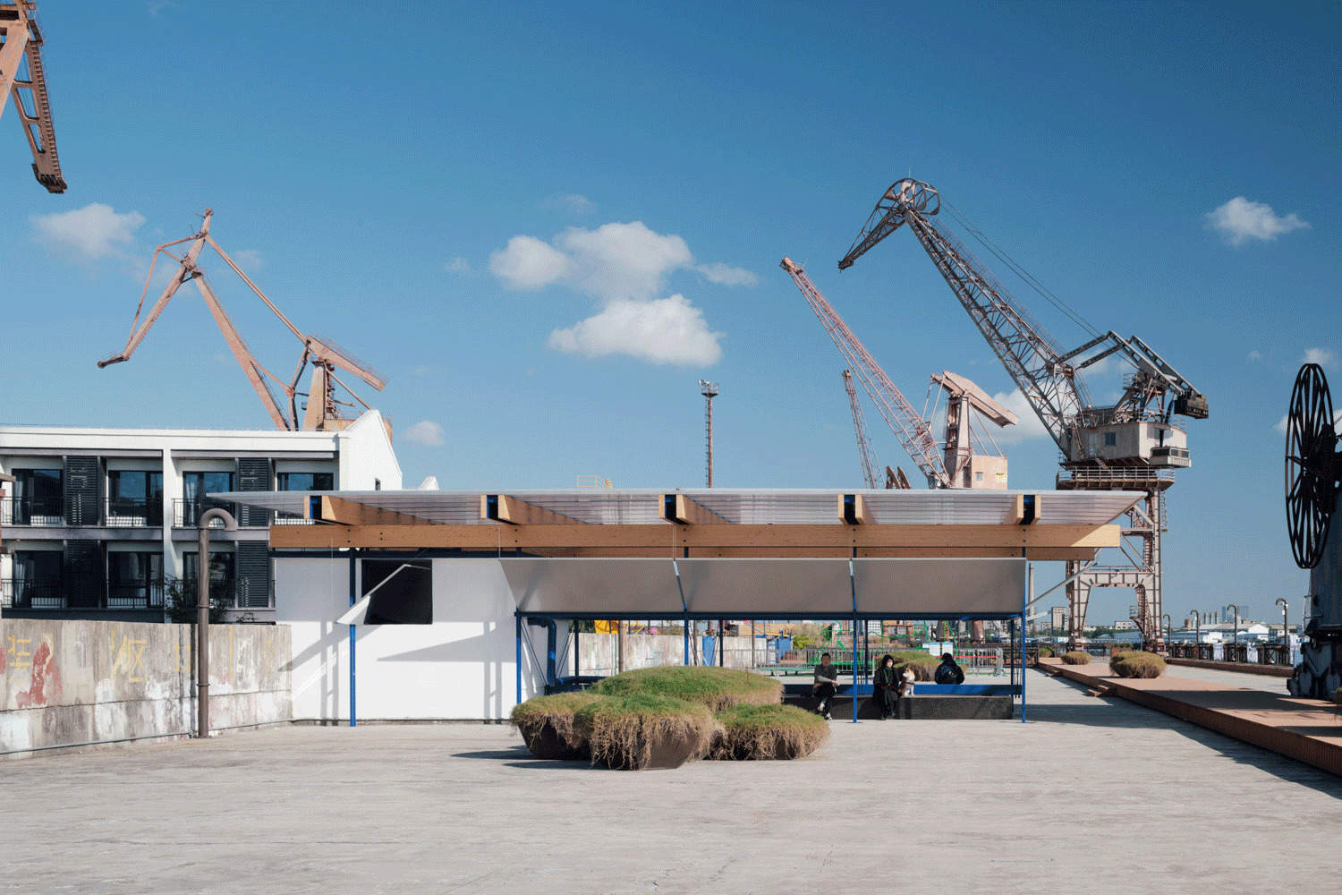 浮舱是 2025 上海城市空间艺术季(SUSAS)的参展项目,位于上海杨浦区复兴岛船台公园的高桩码头上,作为一处日常供市民游客在江边休憩、以及举办活动时辅佐性公共空间。浮舱的概念源于场地,高桩码头、造船塔吊、水泵房及防汛墙都提示着中华船厂的工业历史场所记忆。