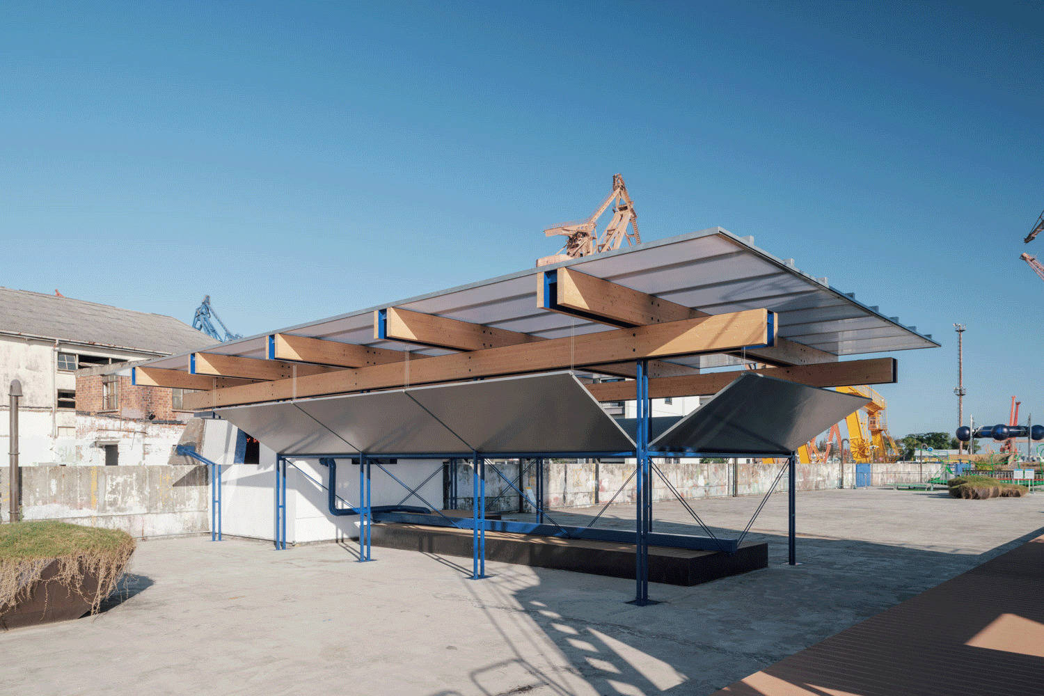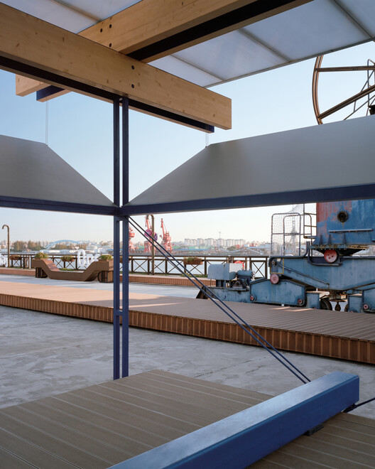 精妙的机械美学与动态空间生成:项目最精髓之处在于其集成了机械动力系统的结构设计。利用钢双立柱、胶合木梁、机械滑轮系统和拉索,实现了金属“舱板”的定角度翻转功能,这不仅是对船厂机械结构的致敬,更赋予了空间生命力。通过舱板的开合,浮舱可以从日常休憩的“静默悬浮”状态,切换至具有展示或集市功能的“多层开放”状态。这种内在的“可动性”使其成为一个具有潜能的、能够主动回应不同使用需求的灵活架构。